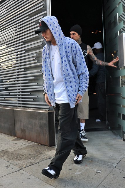 Anyway, photos also attached of a crusty Slim Shady, per usual, out and about Hollywood before the performance. Many of you have noted that he’s working the manorexic look these days. Yes totally. Since getting clean, it’s like he’s addicted to being skinny now. When he was using, he had ballooned to over 200 pounds. One extreme to the other...