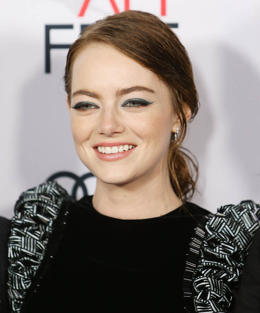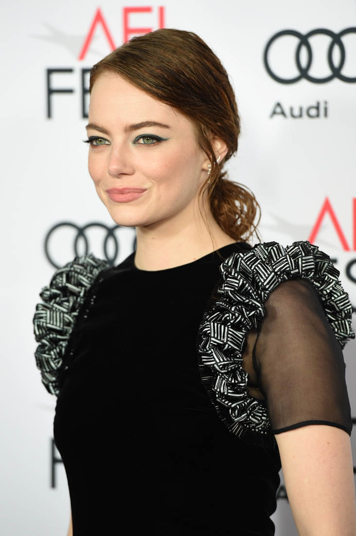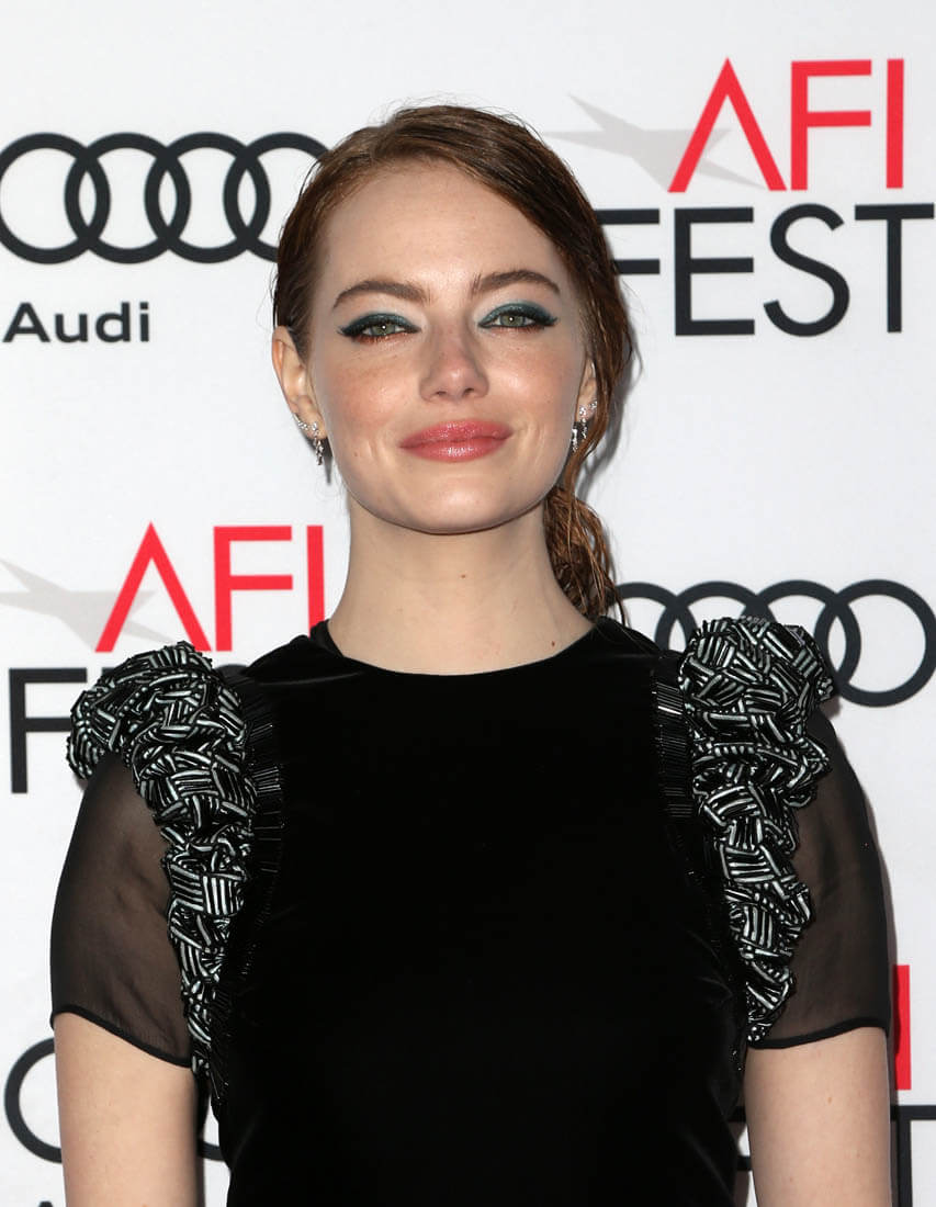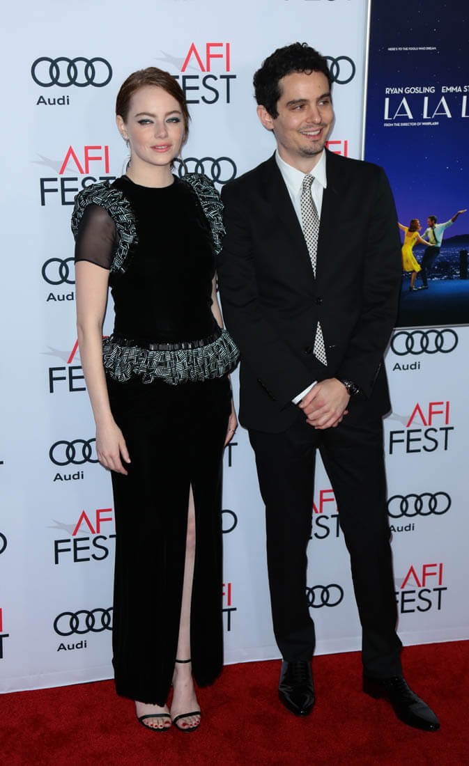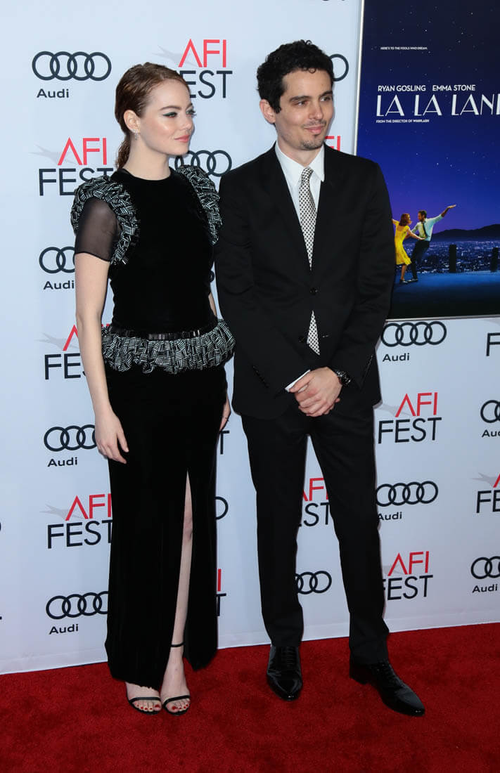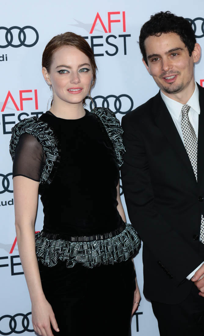 Emma and director Damian Chazelle were at the AFI Fest screening of La La Land last night. Her dress is Armani Prive. It reminds me a little of Anna Wintour’s Chanel at the MET Gala a few years ago when the theme was superheroes, just in the shoulders: