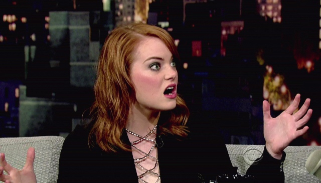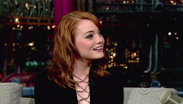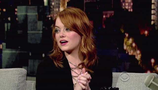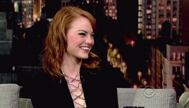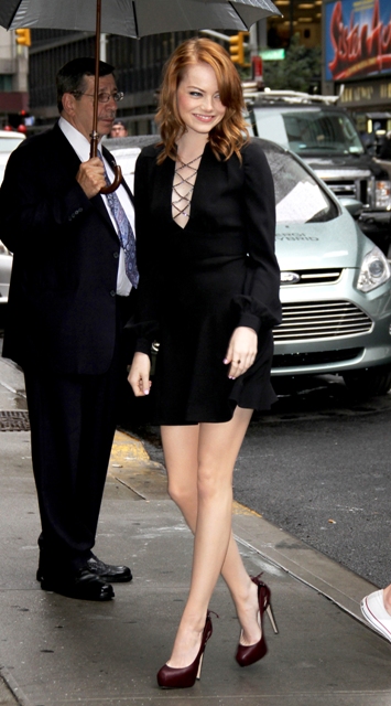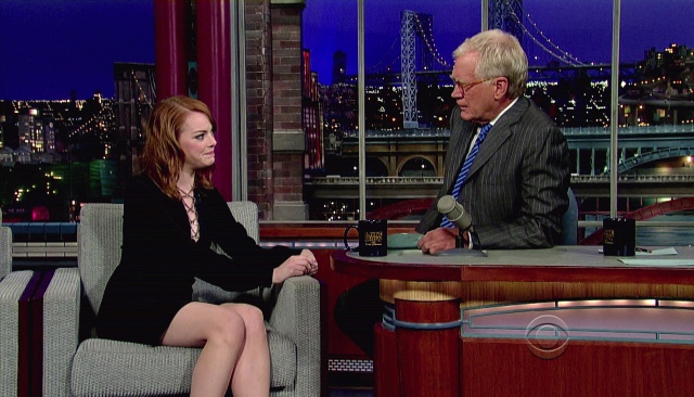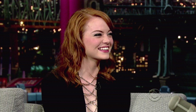 This is Emma yesterday at Letterman and apparently she bewitched him. I would like this dress better if the webby part wasn't metallic. Also, in grey today on the morning show circuit.