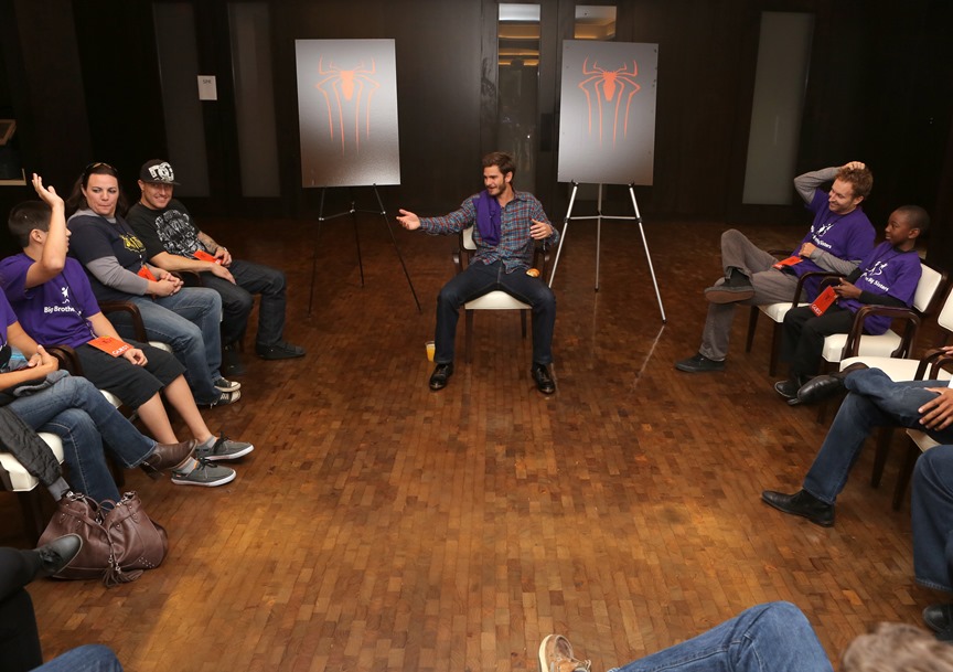 Just as it’s been a while since we’ve seen the Brange, it’s also been months since we’ve seen Emma Stone and Andrew Garfield out together in LA. Emma spent part of the summer working in France on a Woody Allen film and then the two were in England together in late August/early September celebrating his 30th birthday. Click here for a refresher. She was red then. And now she’s back to blonde. Gwen Stacy is blonde. And we’re now less than 6 months out from the release of The Amazing Spider-Man 2. So both of them were joined by Jamie Foxx at a fan event for the movie on the Sony lot on Saturday where they spent time with kids from Big Brothers and Big Sisters.