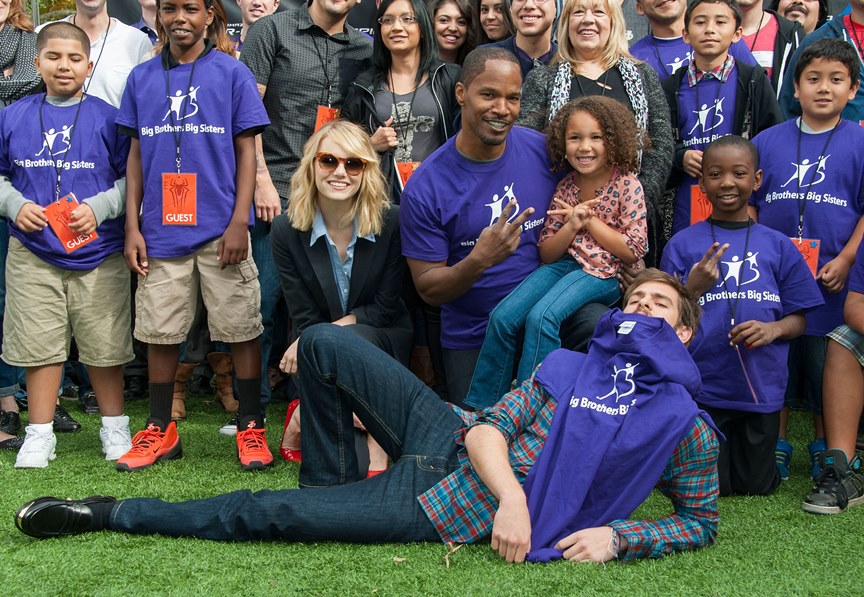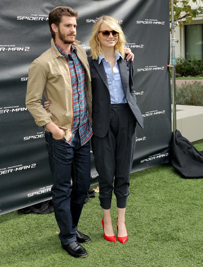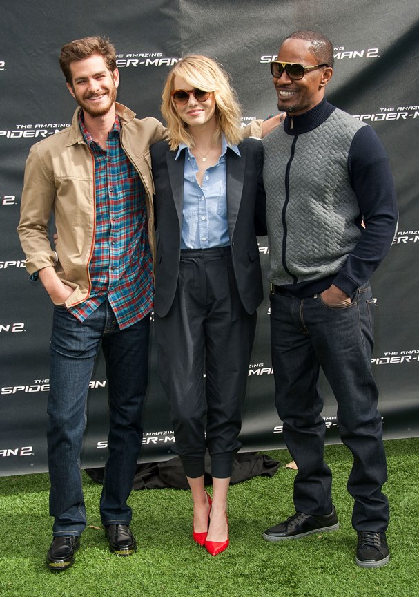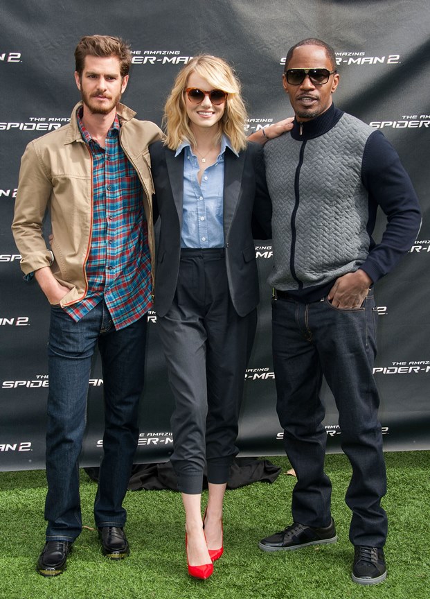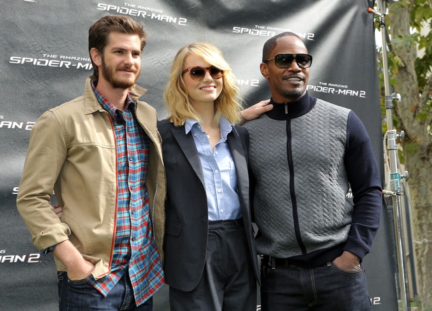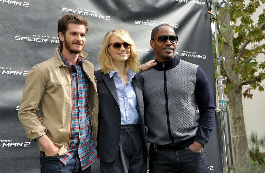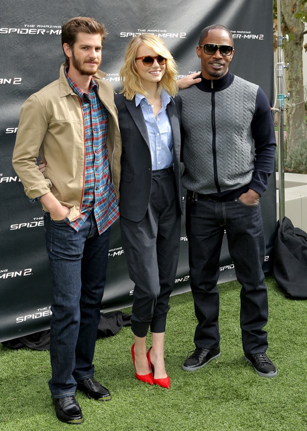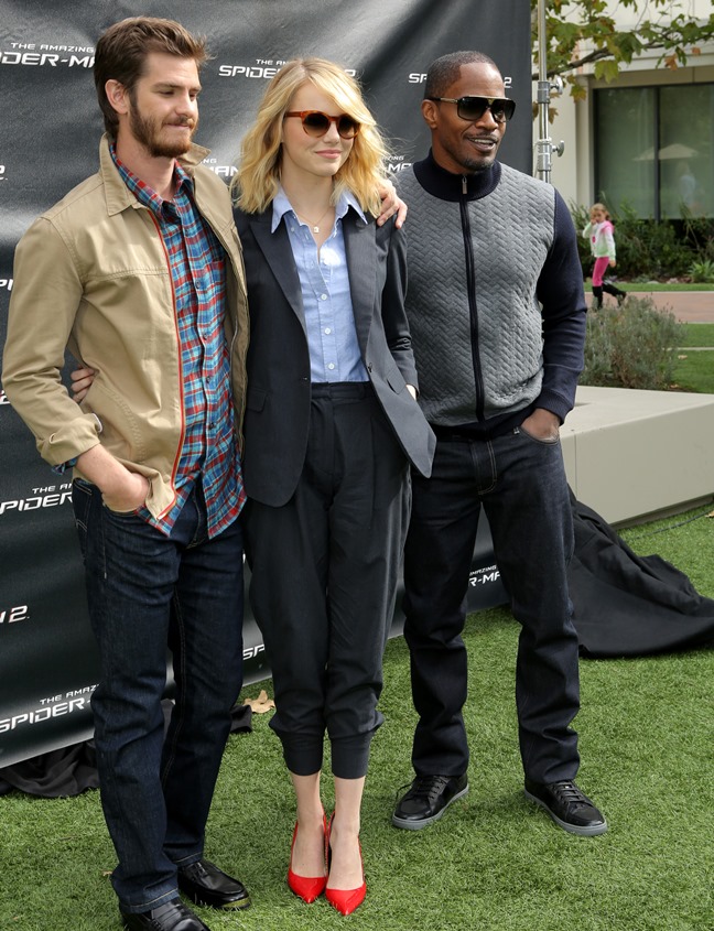 Just as it’s been a while since we’ve seen the Brange, it’s also been months since we’ve seen Emma Stone and Andrew Garfield out together in LA. Emma spent part of the summer working in France on a Woody Allen film and then the two were in England together in late August/early September celebrating his 30th birthday. Click here for a refresher. She was red then. And now she’s back to blonde. Gwen Stacy is blonde. And we’re now less than 6 months out from the release of The Amazing Spider-Man 2. So both of them were joined by Jamie Foxx at a fan event for the movie on the Sony lot on Saturday where they spent time with kids from Big Brothers and Big Sisters.