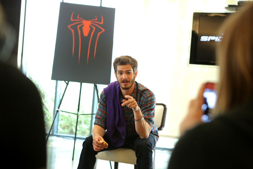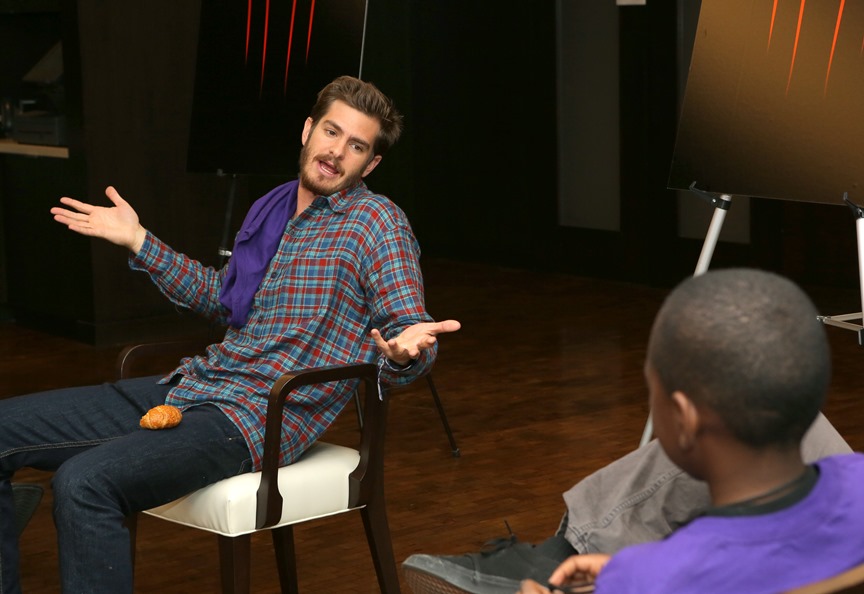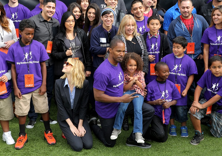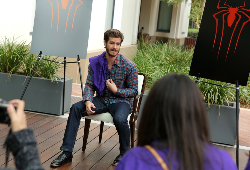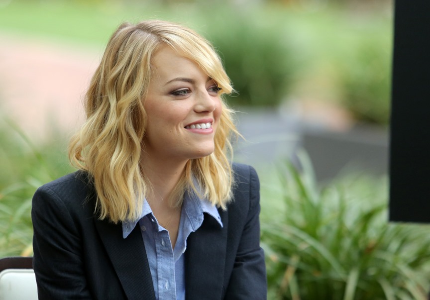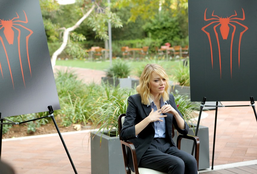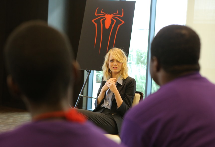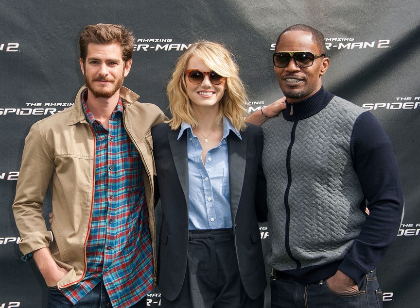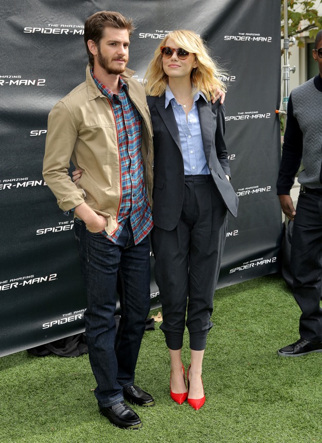 Just as it’s been a while since we’ve seen the Brange, it’s also been months since we’ve seen Emma Stone and Andrew Garfield out together in LA. Emma spent part of the summer working in France on a Woody Allen film and then the two were in England together in late August/early September celebrating his 30th birthday. Click here for a refresher. She was red then. And now she’s back to blonde. Gwen Stacy is blonde. And we’re now less than 6 months out from the release of The Amazing Spider-Man 2. So both of them were joined by Jamie Foxx at a fan event for the movie on the Sony lot on Saturday where they spent time with kids from Big Brothers and Big Sisters.
