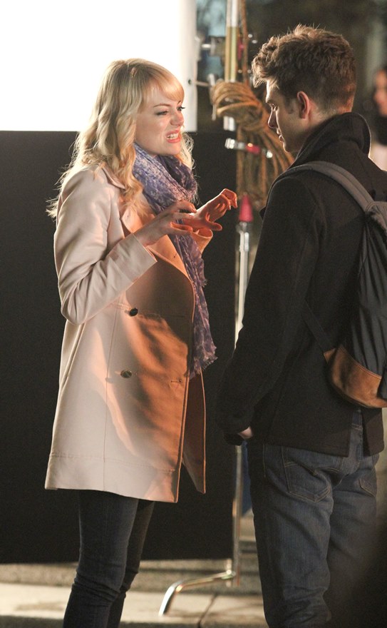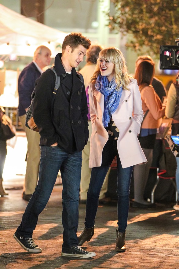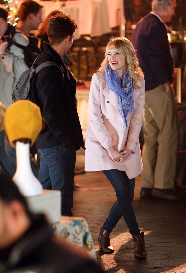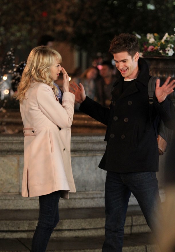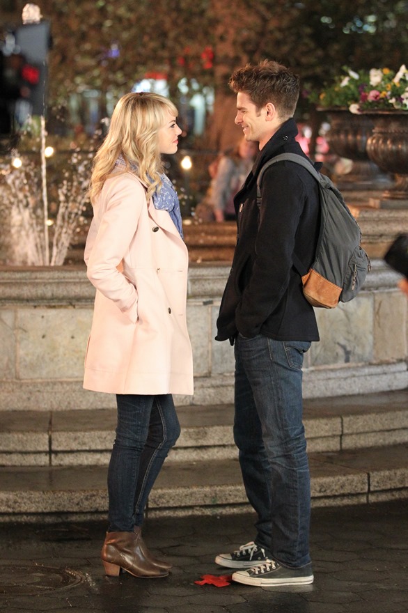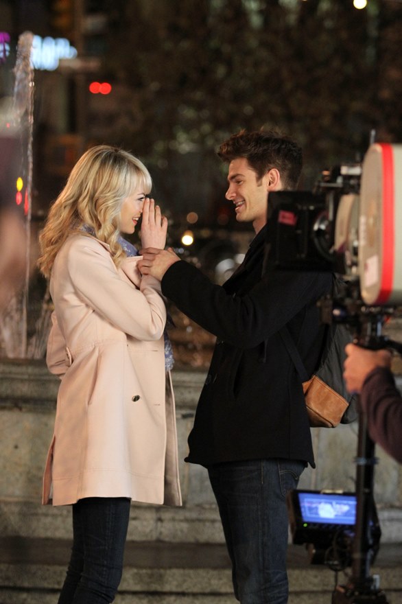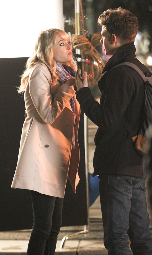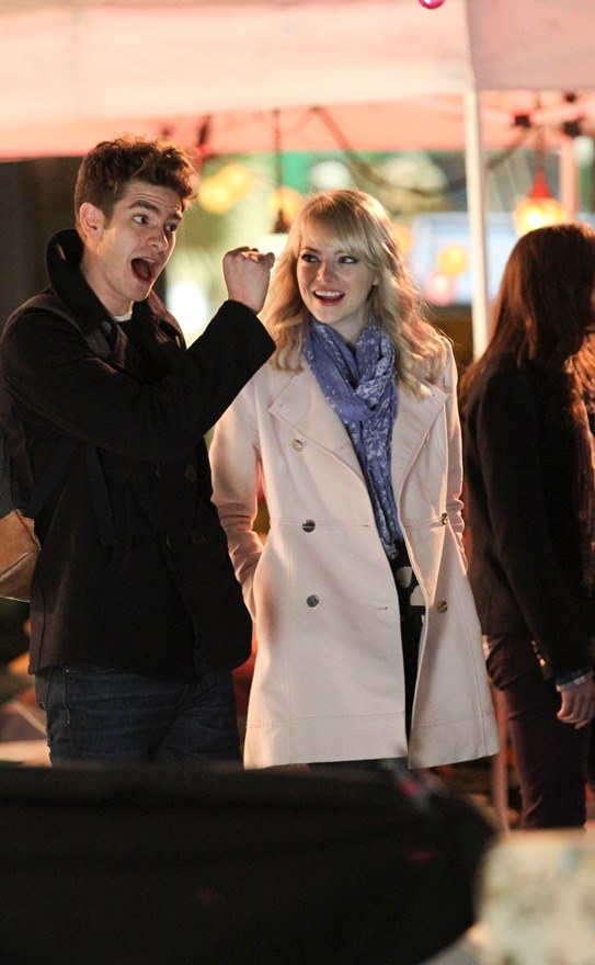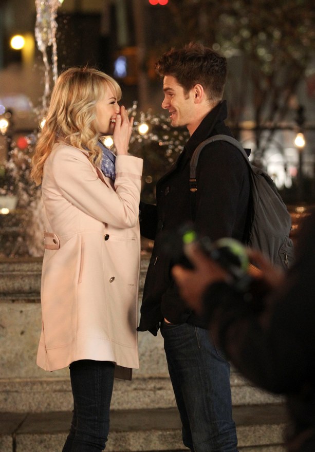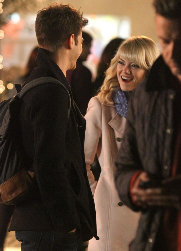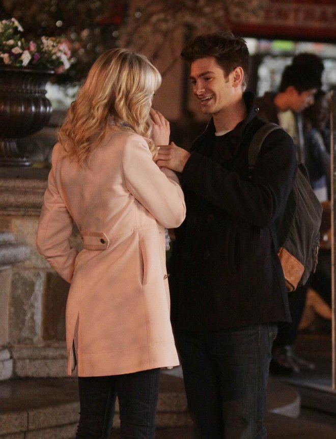 Here are Emma Stone and Andrew Garfield being super cute flirty on the New York set of Spider-Man 2 as Peter Parker and Gwen Stacy. Were they rolling? Probably. But since they’re together in real life and we know they’re together in real life, there’s a possibility they may have not been rolling, right?