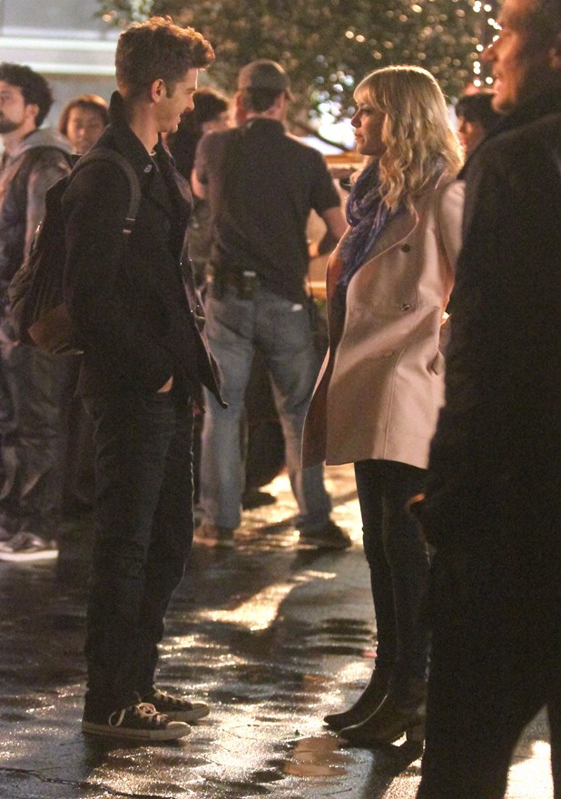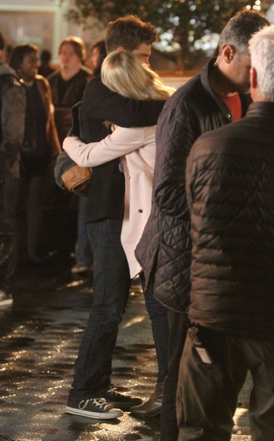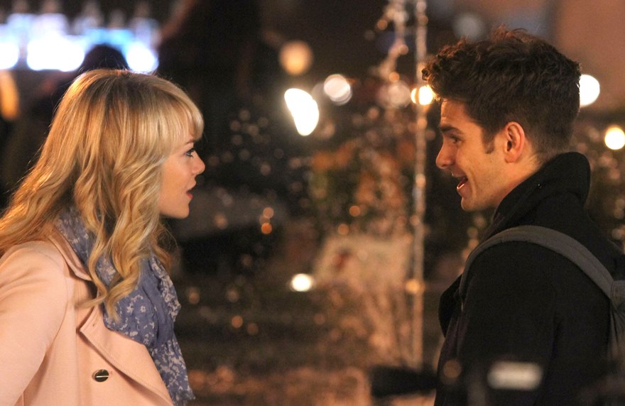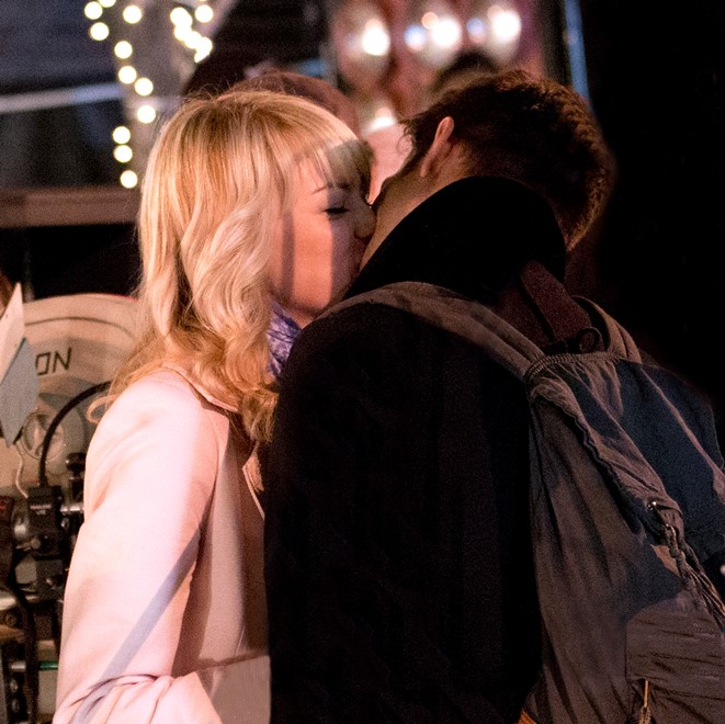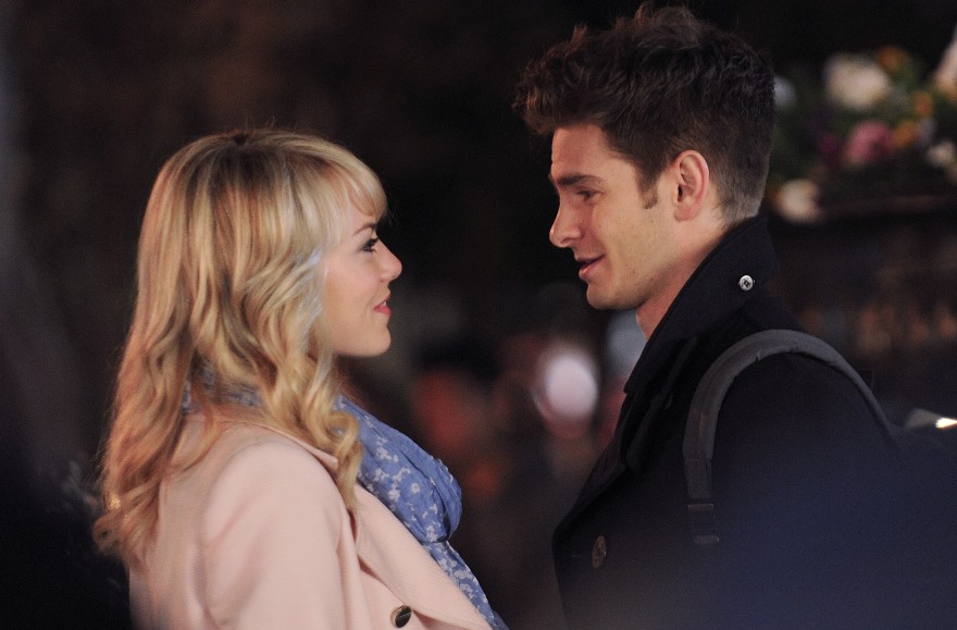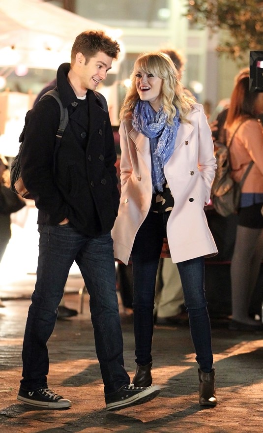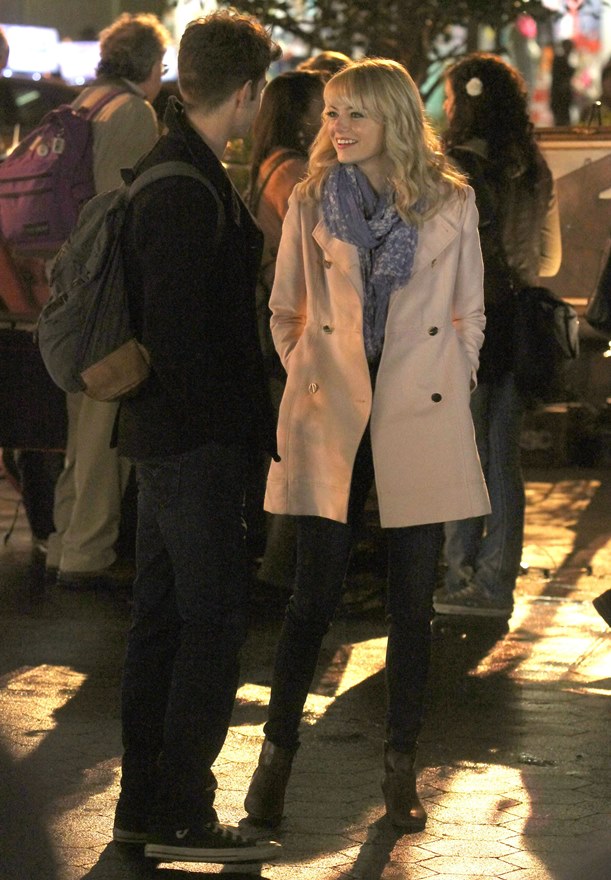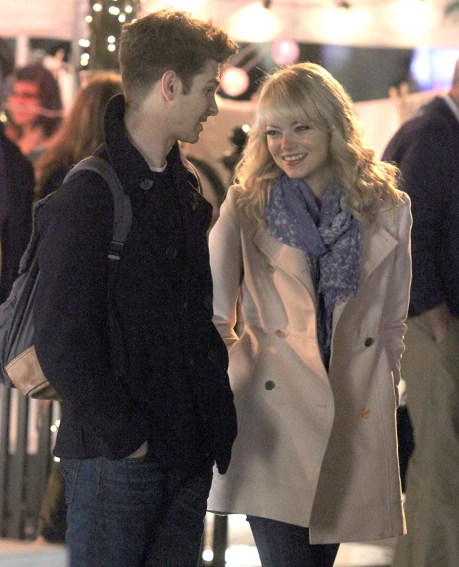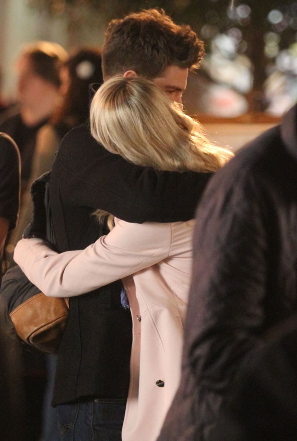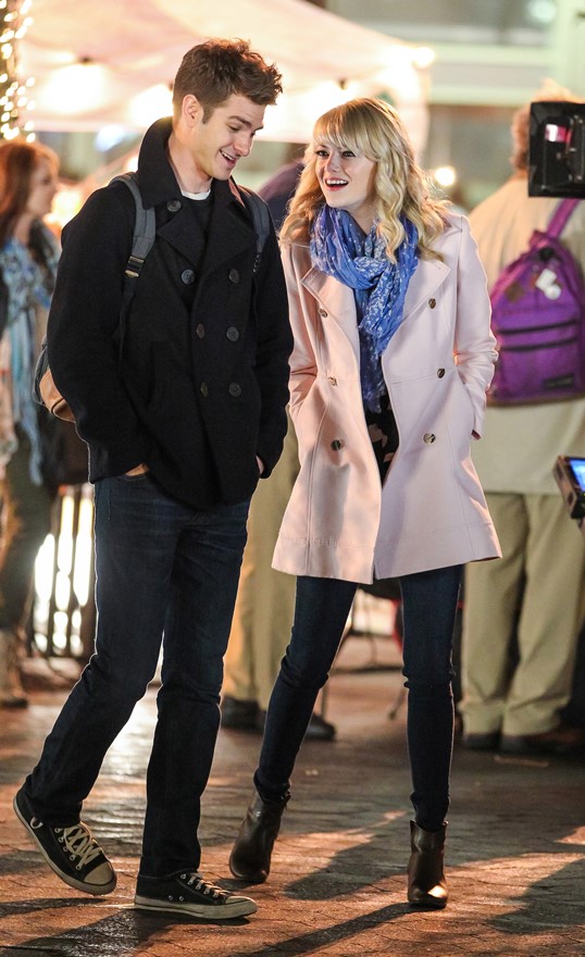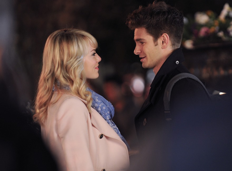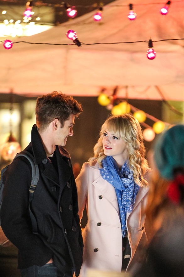 Here are Emma Stone and Andrew Garfield being super cute flirty on the New York set of Spider-Man 2 as Peter Parker and Gwen Stacy. Were they rolling? Probably. But since they’re together in real life and we know they’re together in real life, there’s a possibility they may have not been rolling, right?