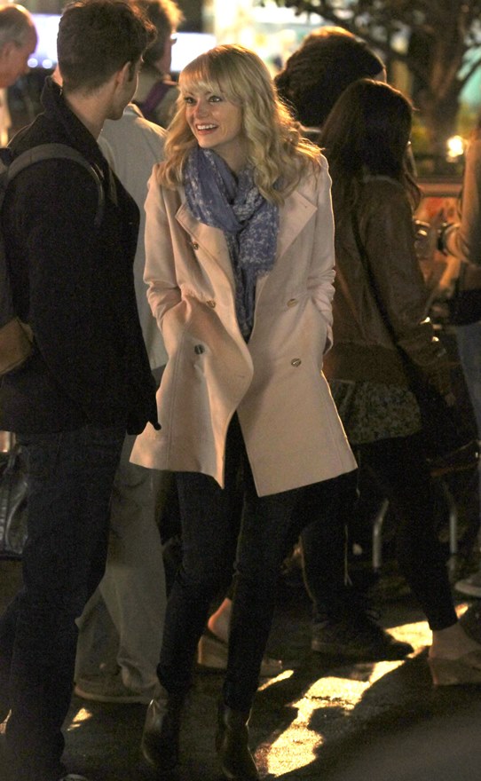 Emma is currently shooting two movies at once. Last week she was photographed working, also in NYC, on Birdman with Michael Keaton. She may have some time off the in the summer and then she’s scheduled to start working on Cameron Crowe’s next film with Rachel McAdams and Bradley Cooper in October. That’ll take her to the end of the year, and after that she’ll start 2014 on Guillermo Del Toro’s Crimson Peak, a ghost story, alongside Jessica Chastain, Benedict Cumberbatch, and Charlie Hunnam.
