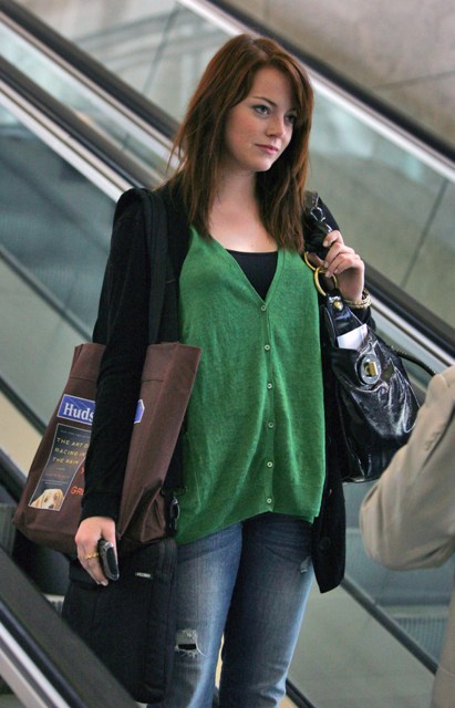 Emma showed up in red last night at the premiere of Zombieland. Not crazy about the way she was styled. Unflattering dress, too old. It’s for cougars. Or aging models like Rachel Hunter. She looked much cuter the other day arriving at LAX. See?