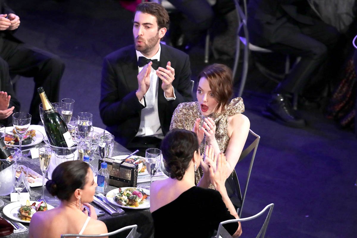 What do you call it though when it’s neither “red carpet official” nor “Instagram official”? This is where we find Emma Stone and Dave McCary. They were courtside at the Laker game last week which was the first time they were “official” in public together. And last night Dave was with Emma at the SAGs, skipping the carpet photos but seated side by side at her table. They also agreed to be photographed together, but not alone. Bradley Cooper rounded out the group: