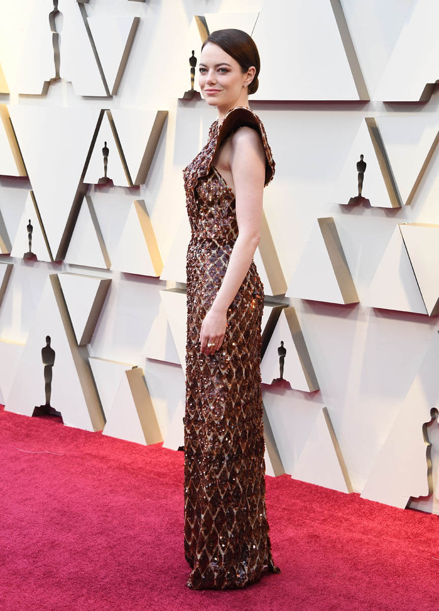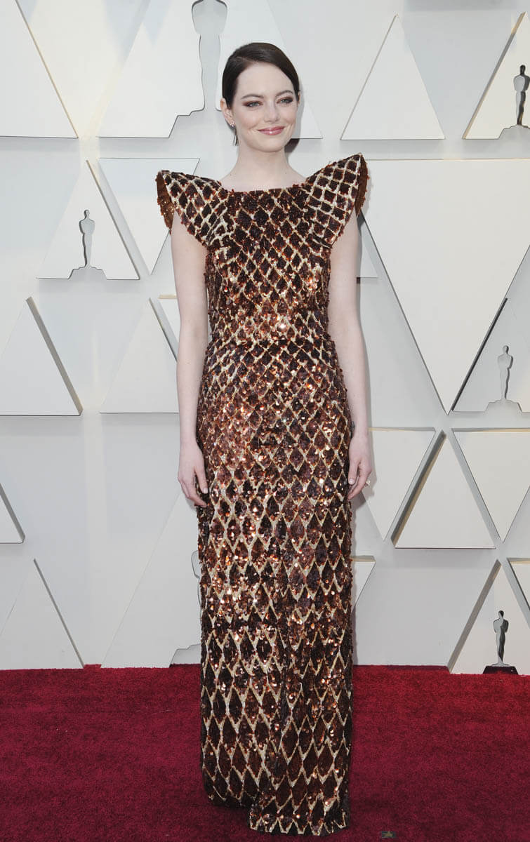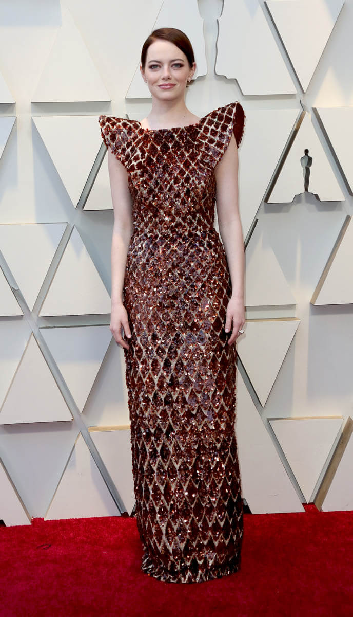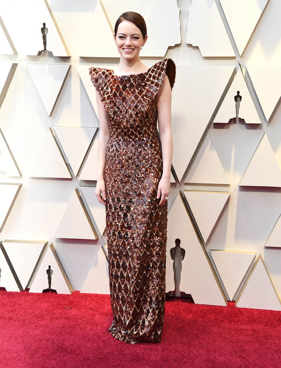 Emma’s Louis Vuitton was easily a Best Dressed candidate. Duana, Kathleen, and I all loved it and the only reason why she’s not Best Dressed for one of us is because, well, she’s just too good at this. Other people have to win the game once in a while. This piece is really f-cking special though. And it gets better the more you pay attention to it, the more it reveals itself. Zoom in if you can on the rich colours that come out in different light, and the detailing, the way it’s textured, how it can look at once soft and furry from some angles and abrasive and rough from others. Pointless to waste this kind of fabric (???Can you even call it fabric???) on a boring shape. You need those exaggerated shoulders to give the fabric its due. This is weird material, it demands a complementarily weird structure. And of course it would be Emma Stone and her stylist Petra Flannery to appreciate it.