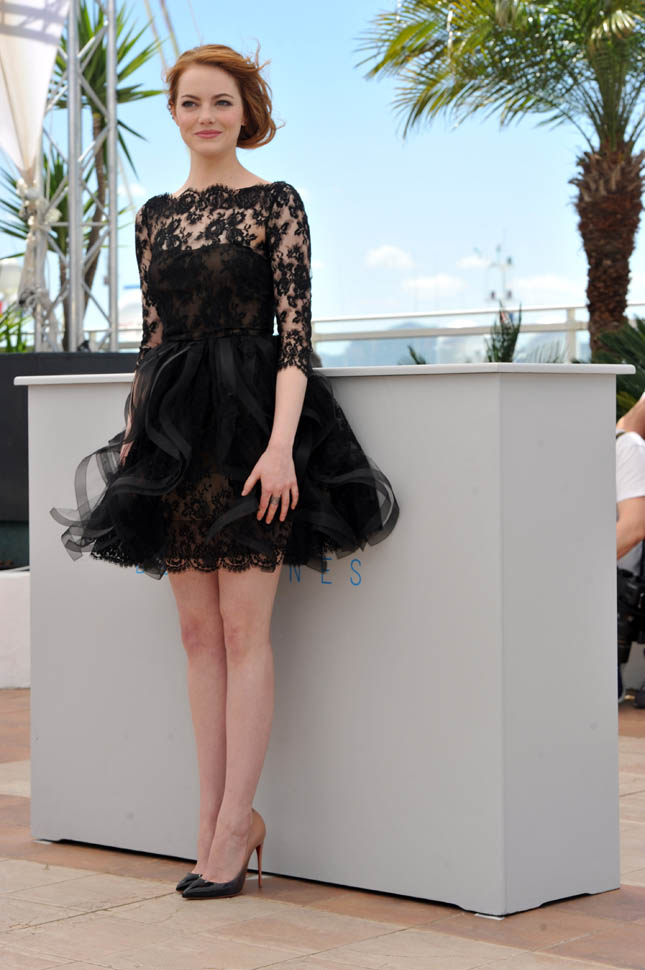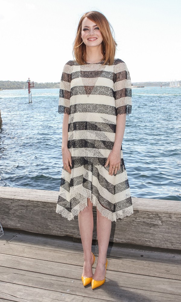 Woody Allen’s Irrational Man photo call and presser in Cannes today. And Emma Stone’s Cannes first time. Maybe that’s why Emma went with a cocktail dress? I mean it’s not a gown. But I feel like it’s a dress you might see at a party. And also a lot more formal than we’ve seen from her before at this kind of event. Think of how she is normally when she’s on a press tour. For example, this is Emma in Sydney for Spider-Man 2, one of my all-time favourite outfits she’s ever worn: