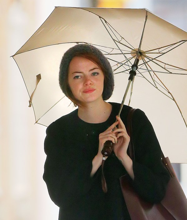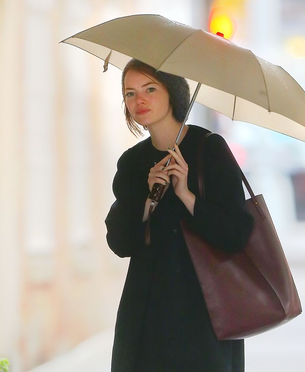 Emma Stone was photographed in the rain in New York today looking really cute in that hat. They never sit like that on my head, I’m so jealous.