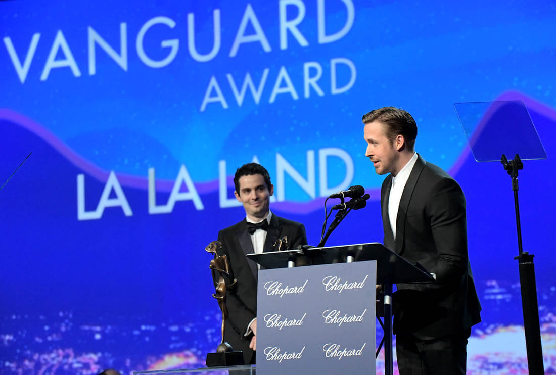 Emma Stone has strep throat, and could not attend the Palm Springs International Film Festival to receive her Vanguard Award - which she shares with Ryan Gosling - last night. It's her first sick day of awards season, as she's attended nearly every pre-Oscar stop on the campaign trail, hitting up film festivals from Middleburg, Virginia to Denver… and back again. This time though, Ryan's covering for her, and so is her La La Land writer and director, Damien Chazelle.