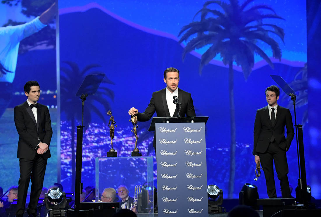 He's not simply saying that Emma's sick and unable to work the room, he makes sure to add extra gravitas to her performance in La La Land, in case critics wanted to dismiss her performance as light or flimsy. Have you seen La La Land yet? The first twenty minutes is the typical musical we've come to know and love - light, frothy and candy-coated, but it takes a turn and shows what Emma and Ryan truly risk in order to achieve their Hollywood dreams. Damien wants you to notice how hard she worked, and how she nailed the part, because his words and praise could make up for her absence and leave a lasting impression on the room.