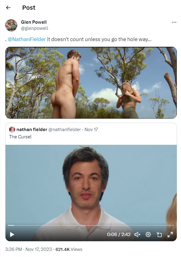 Also, even though Nathan Fielder is a (deliberately) one-note actor—something he and Emma Stone poked fun at when they stopped by Jimmy Kimmel Live last week—he and Emma have better chemistry in 15 seconds than Glen and Sydney have had in either of the Anyone But You trailers. I am actually deeply worried about that movie! It sounded so good on paper but the closer we get to it coming out the more I am getting disaster vibes! And now other actors are clowning on it as if they smell blood in the water! Ironically, all the hype built up during Anyone But You’s production is now more advantageous for an unrelated television show. Things are going great.