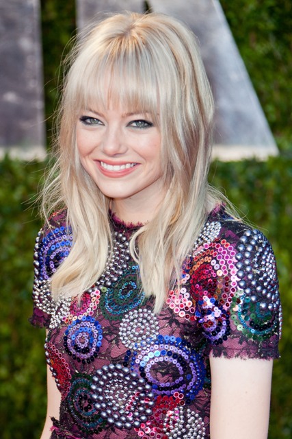 This is Emma Stone at the Vanity Fair party. The fringe ages her. A lot. The fringe with the blonde turns her into an old cougar rock groupie. I hate it. And I hate the beaver tail at the back of her dress. Why is that happening? It’s perfectly adorable without it. It’s totally ridiculous with it. Right out of Carrie Underwood’s closet.