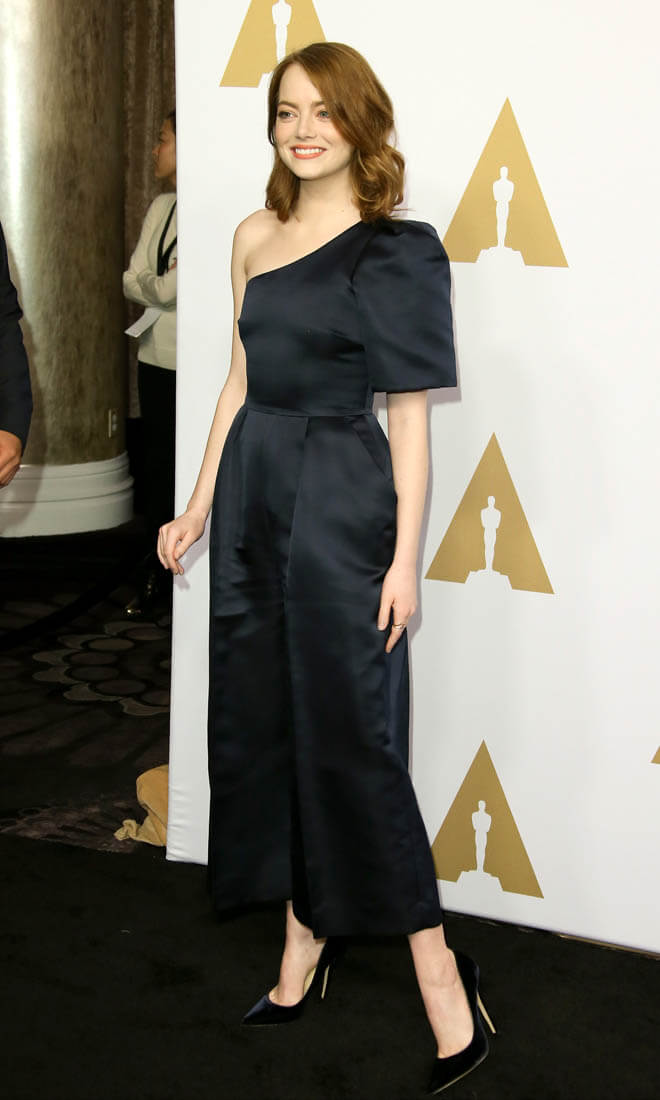 How do you feel about Emma’s one-shoulder black jumpsuit? I like it a lot. You know what’s interesting about this choice though? You don’t stand out in the class photo.