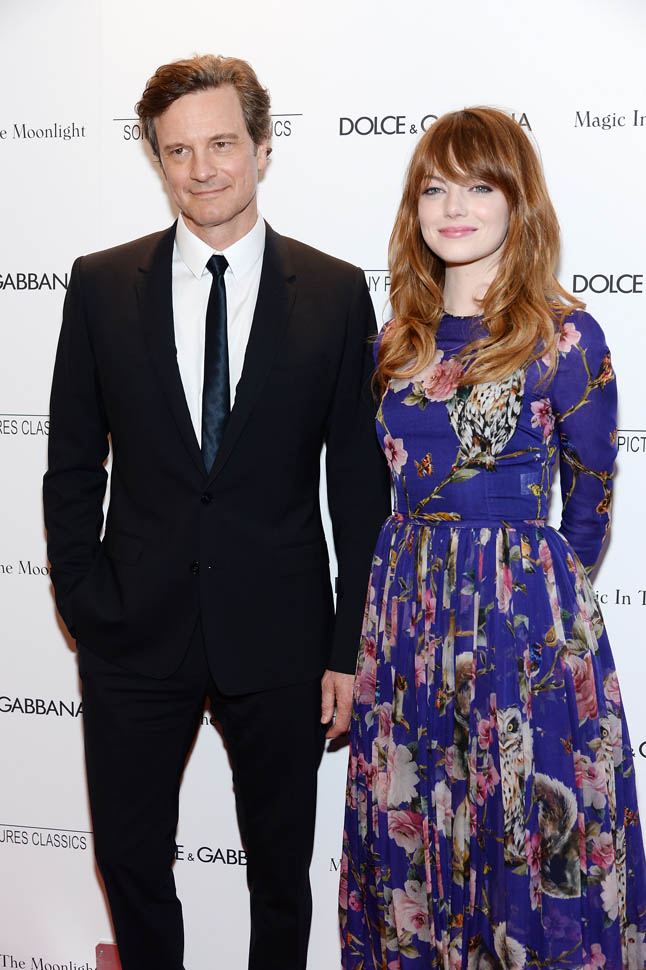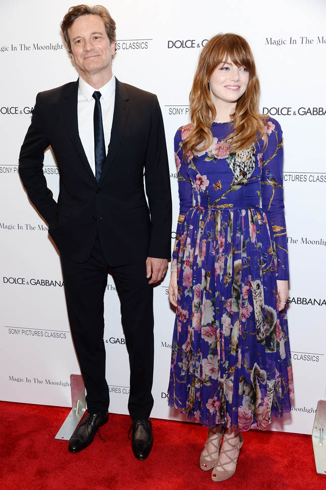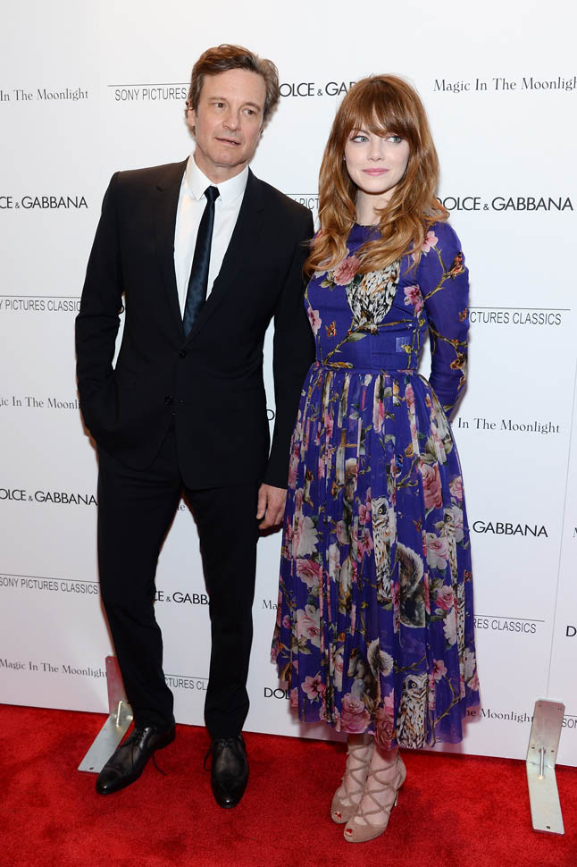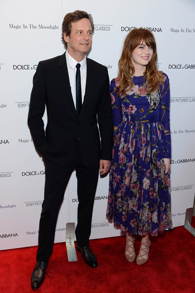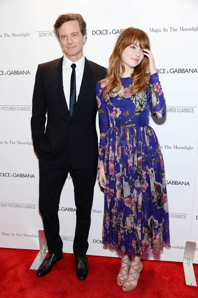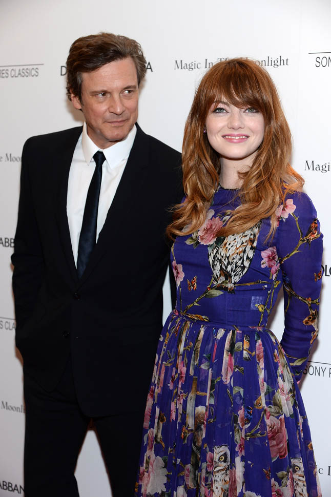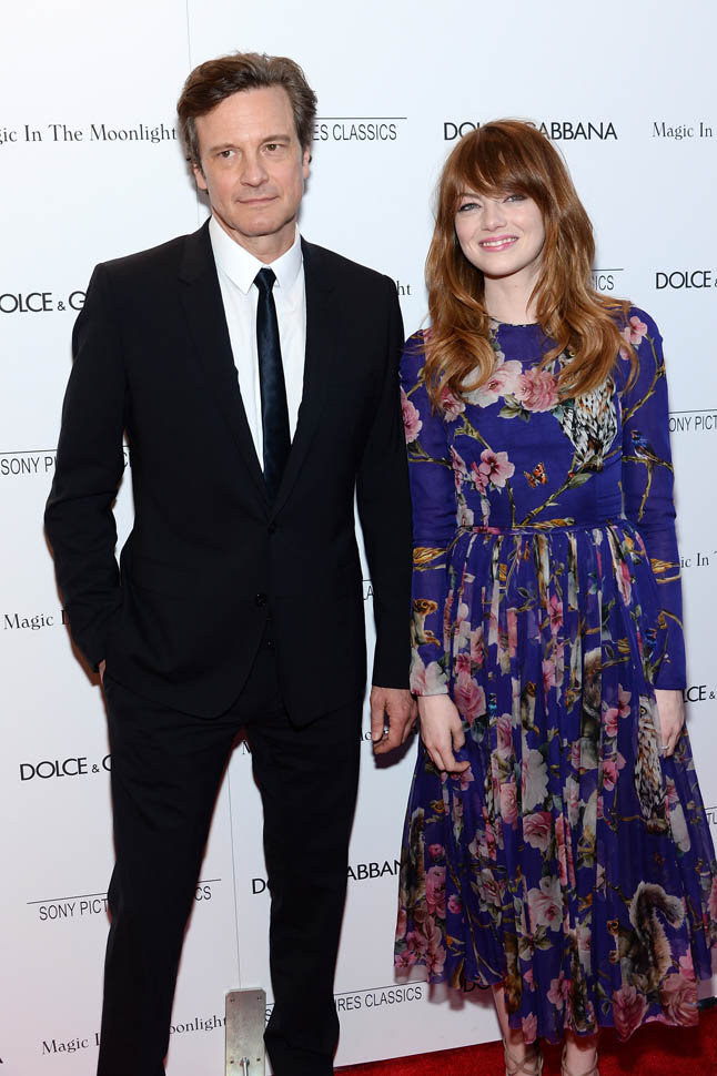 New York premiere of Magic In The Moonlight. Emma Stone showed up with her boyfriend Andrew Garfield. Of course her co-star Colin Firth was there too. Not a bad night, right?