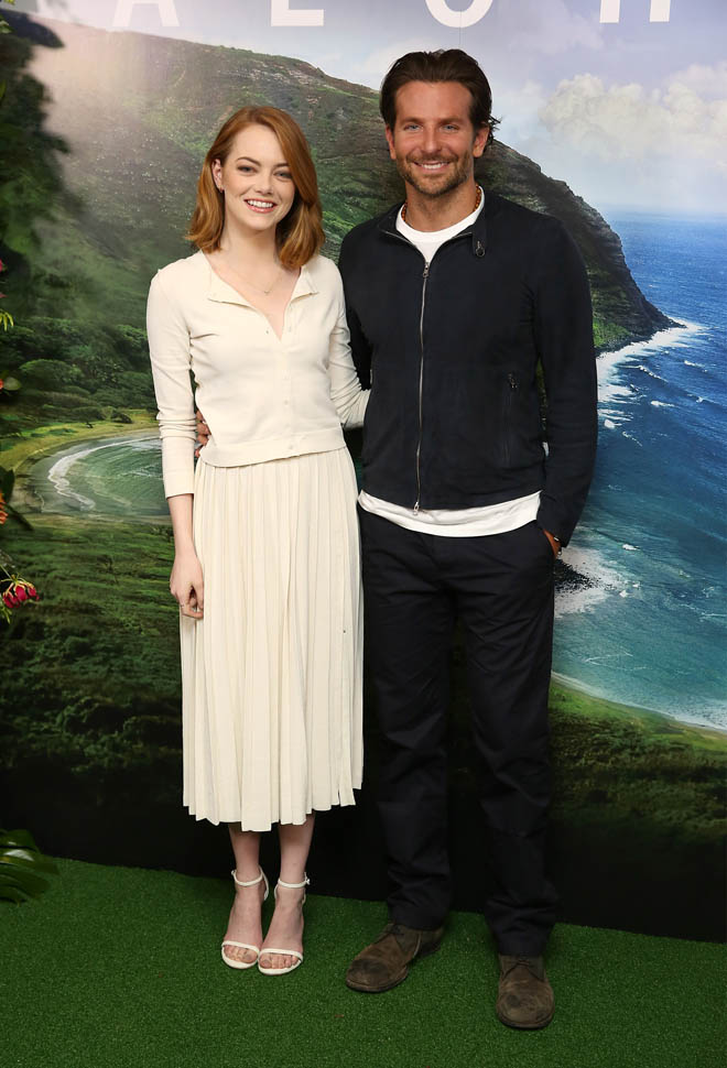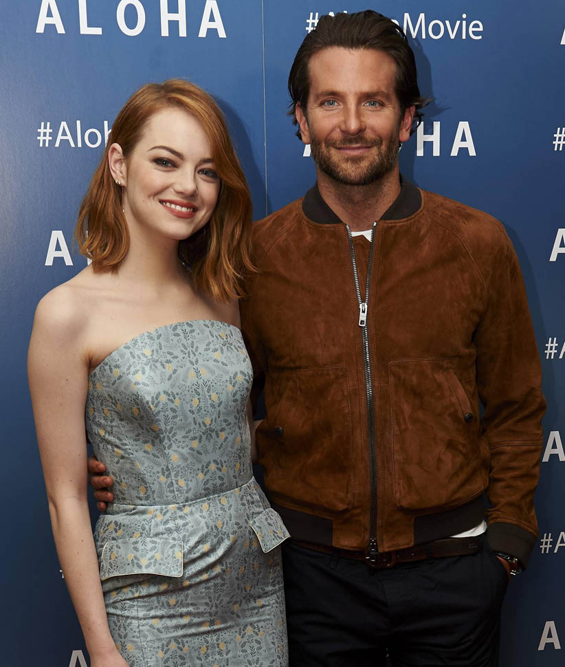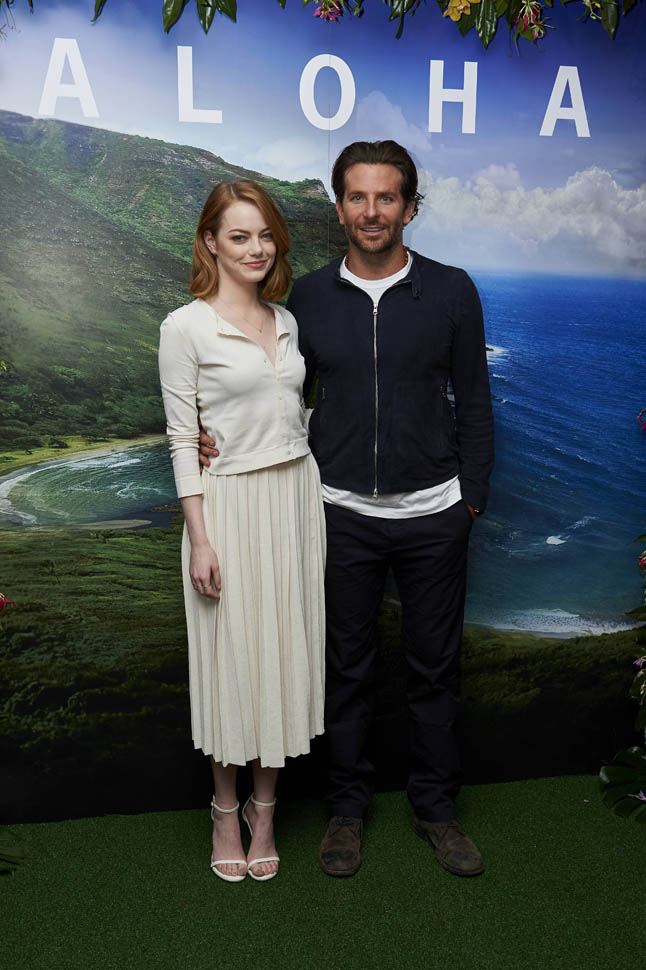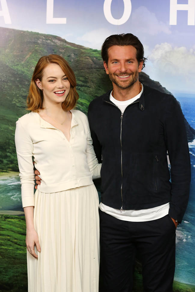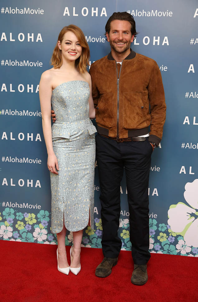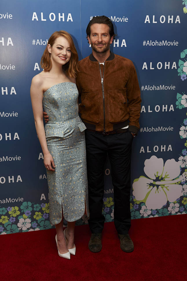 Right after her Cannes debut, Emma Stone flew to London to join Bradley Cooper to promote Aloha. She returned to LA yesterday. On Saturday though, at the screening, fans noticed that she had a couple of significant guests. Before we get to that though, let’s recap the situation so far:
