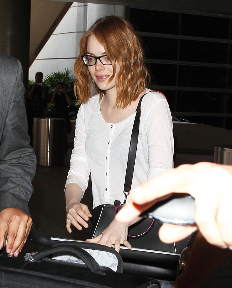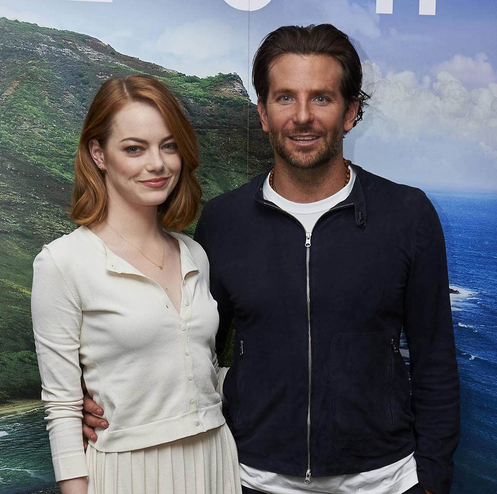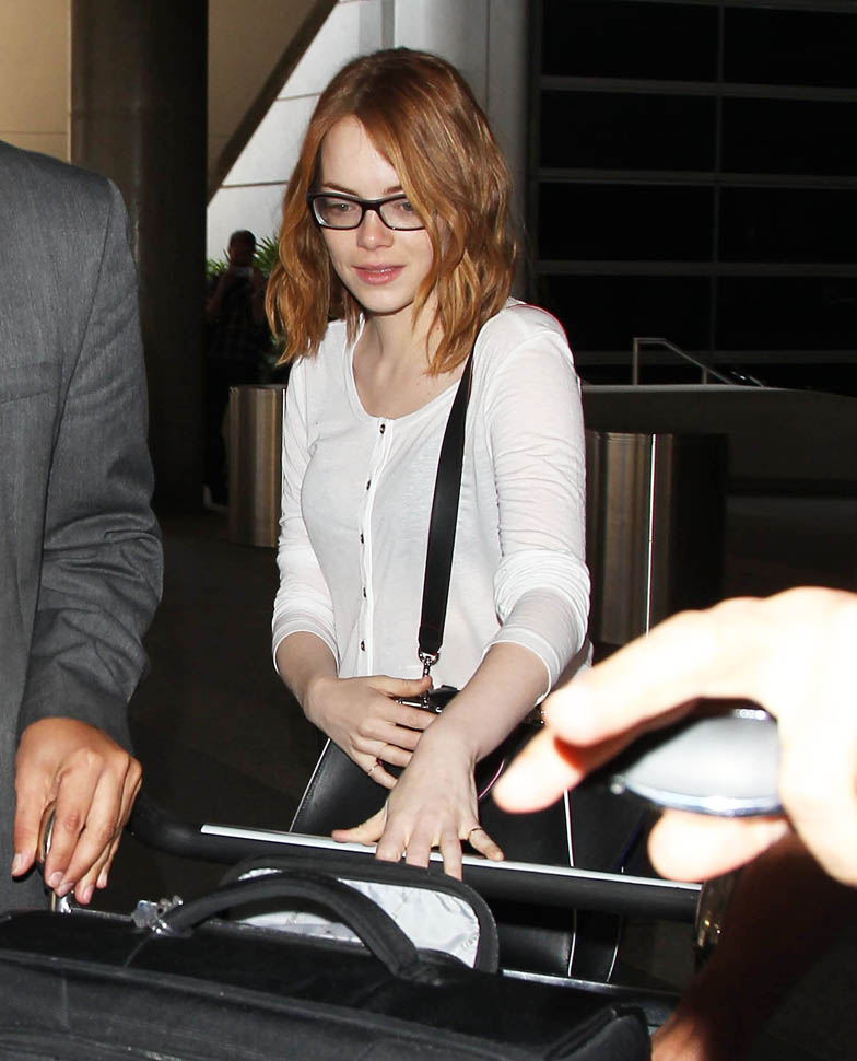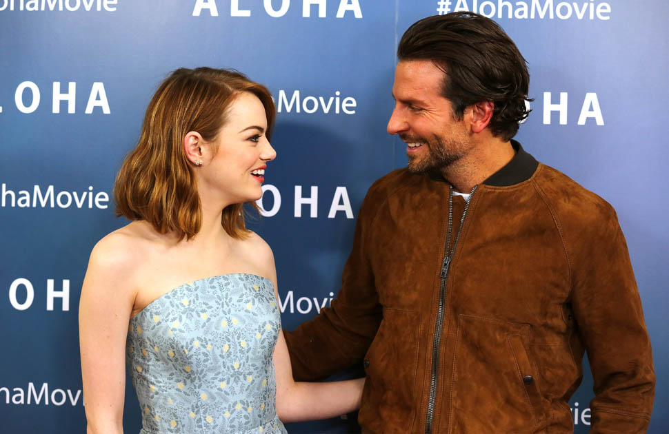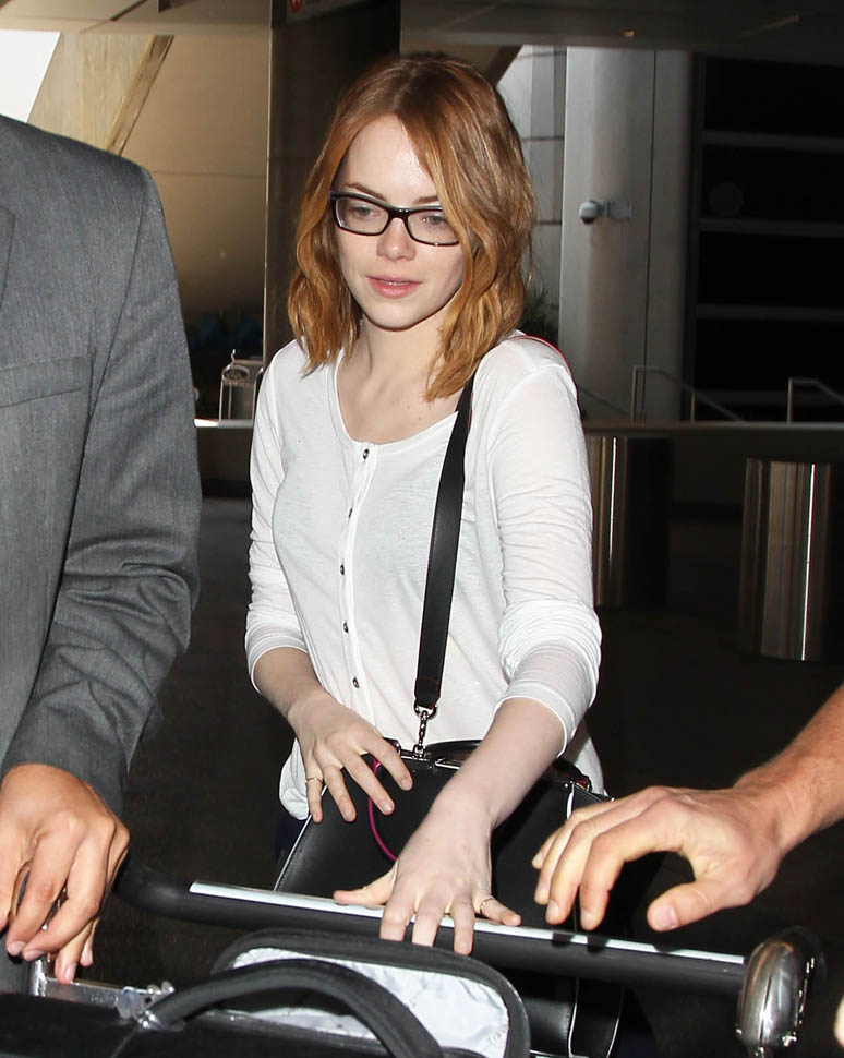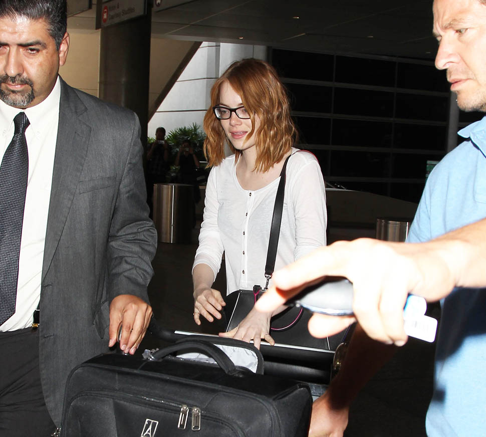 Right after her Cannes debut, Emma Stone flew to London to join Bradley Cooper to promote Aloha. She returned to LA yesterday. On Saturday though, at the screening, fans noticed that she had a couple of significant guests. Before we get to that though, let’s recap the situation so far: