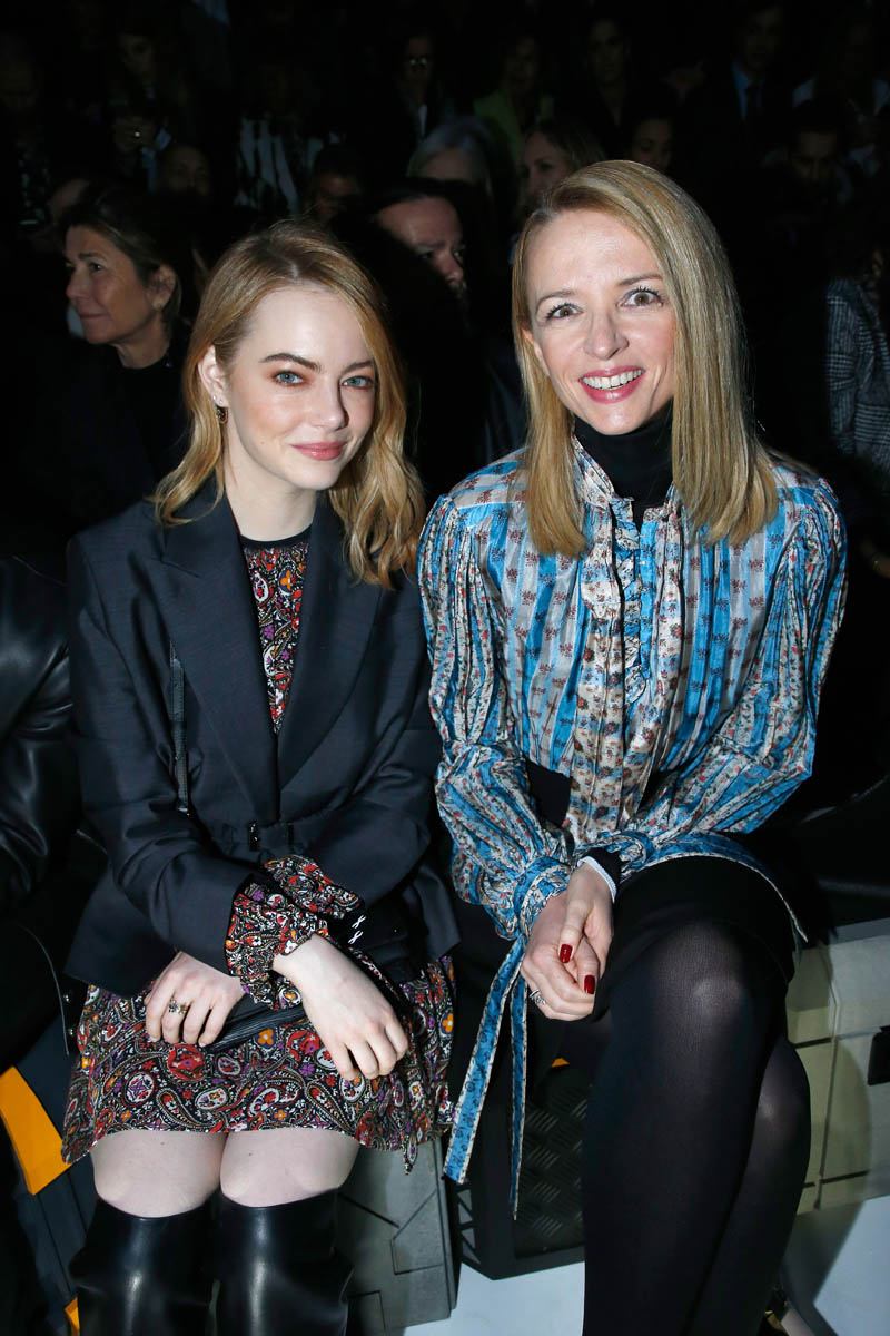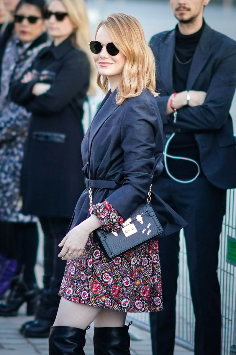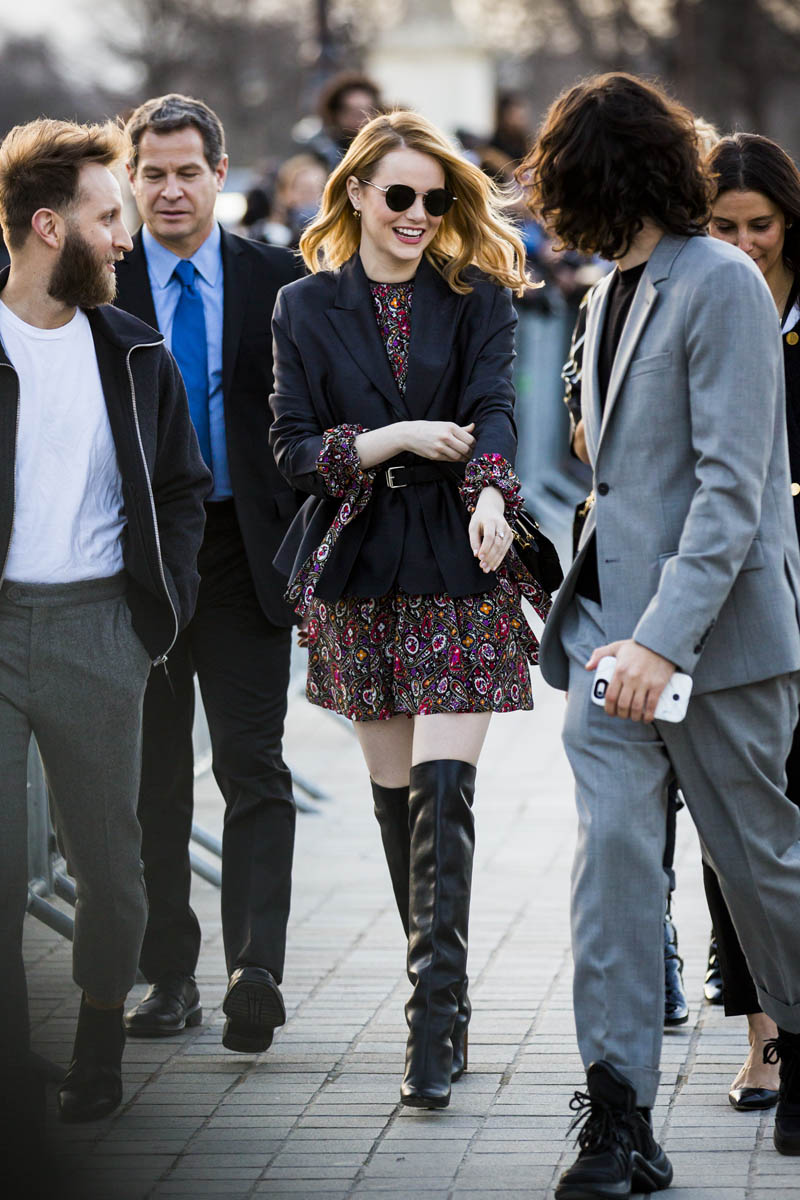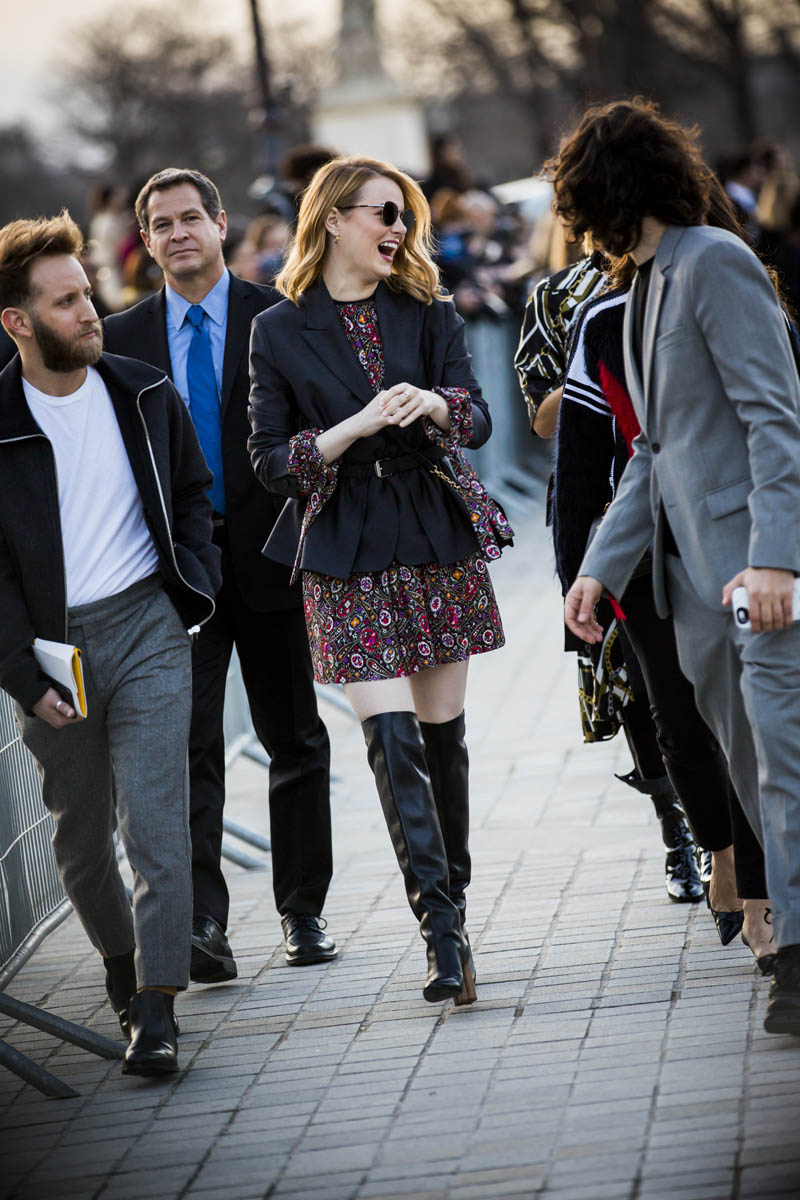 Here she is at the LV presentation yesterday wearing a jacket that’s almost identical to the one she was in at the Oscars, only in black, belted over a printed dress, with a pair of high boots. The boots are the feature item here. Because look at that heel.