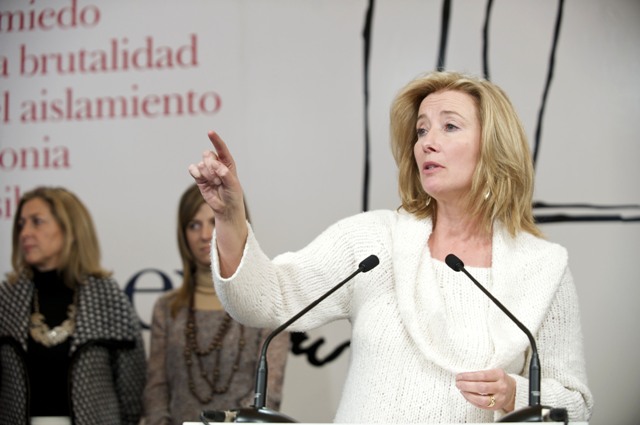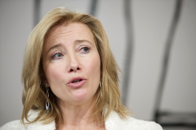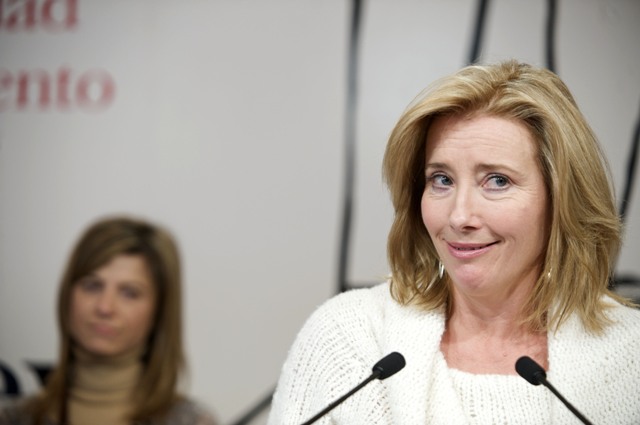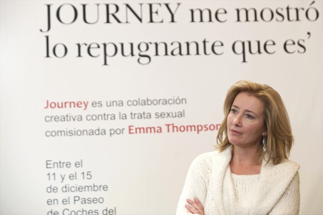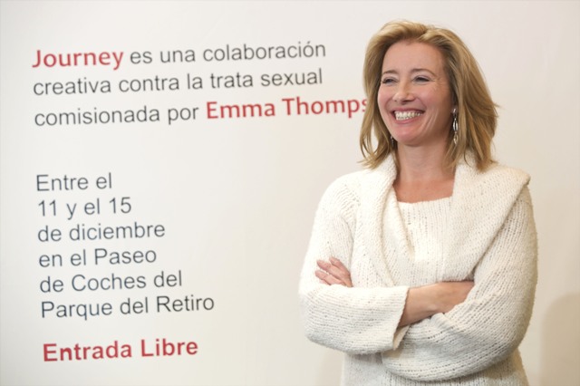 It’s like she’s walking around with a wind machine today – this is Emma Thompson with fresh highlights and a great blowout in Spain presenting “Journey” an exhibition about sex trafficking. It’s our usual animated, amazing Emma. Love her so much.