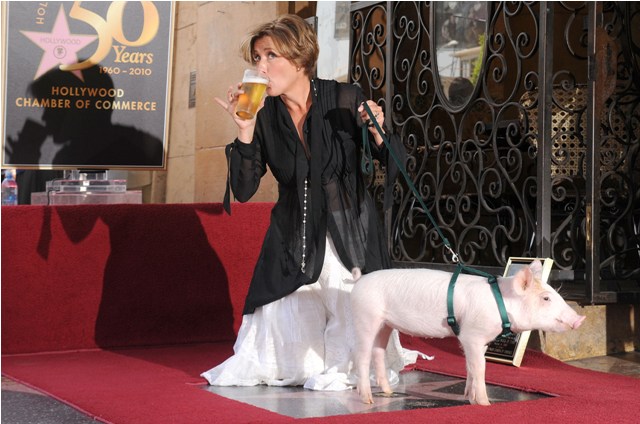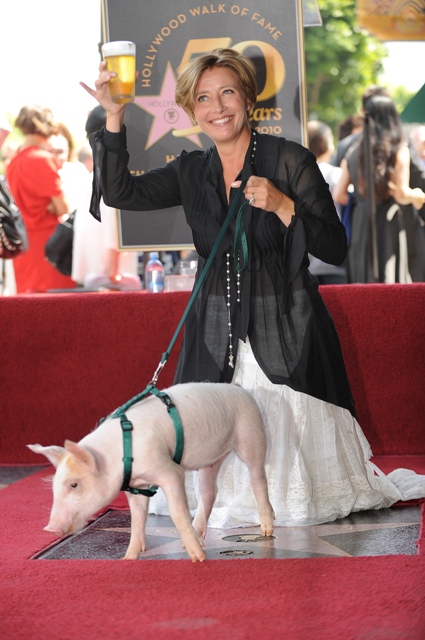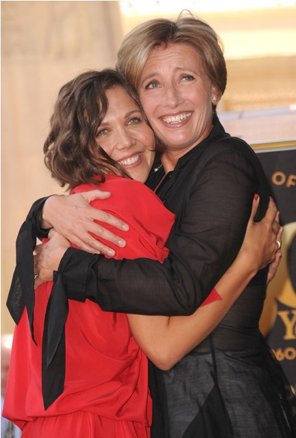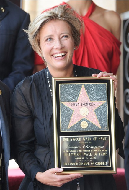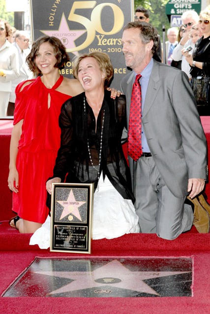 Emma Thompson received her star today on the Walk of Fame. Maggie Gyllenhaal, her co-star in Nanny McPhee and her old schoolmate Hugh Laurie were on hand to celebrate with her. Look at her. She is game for every occasion.