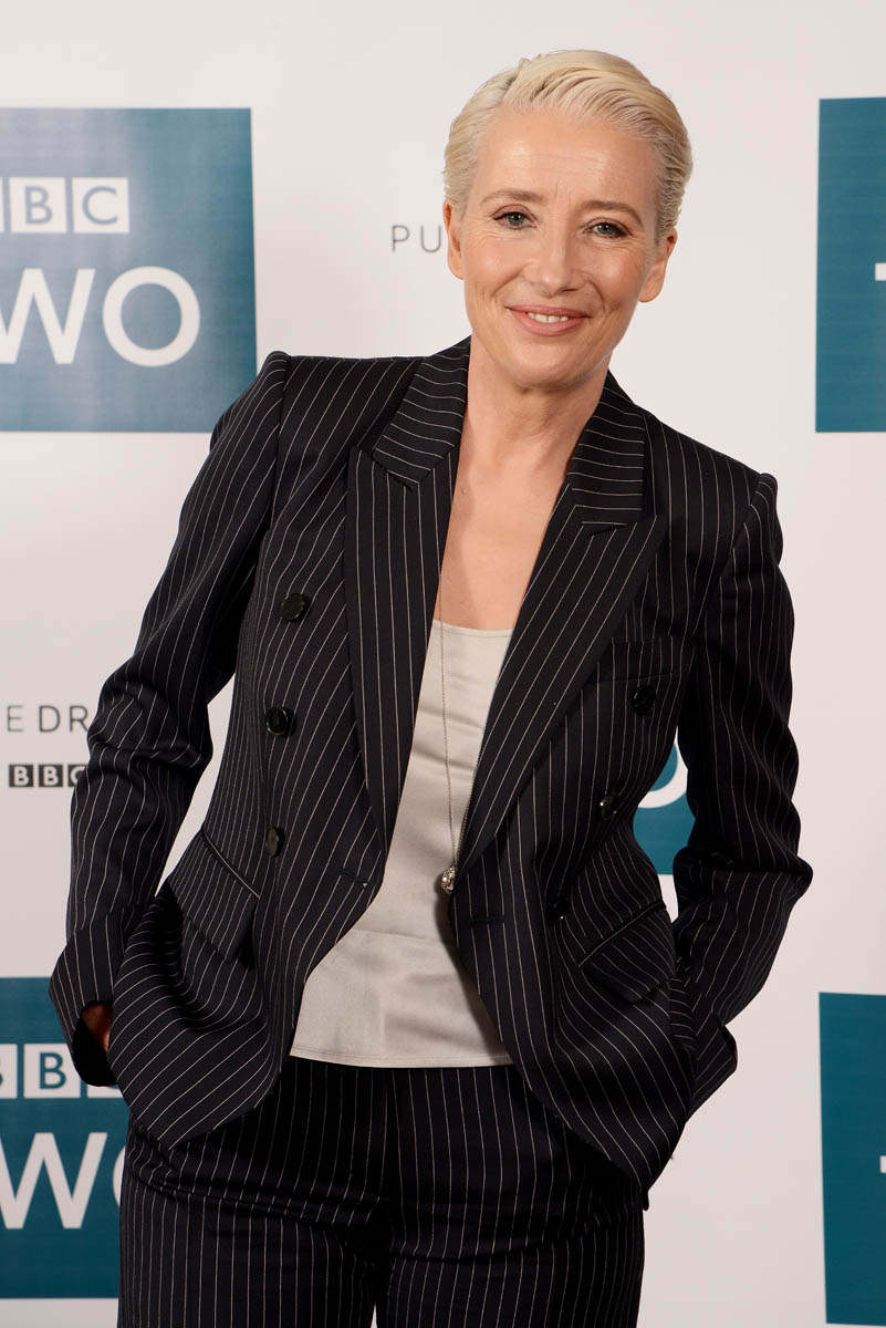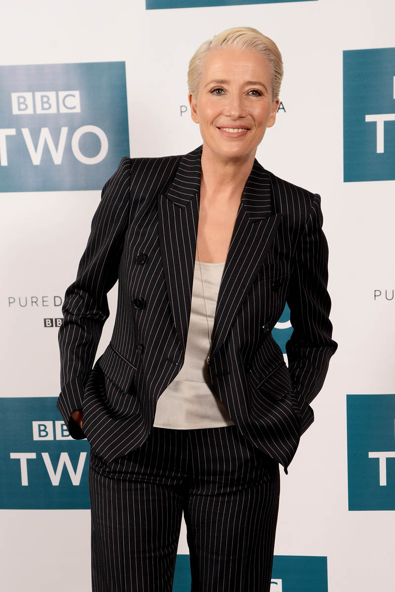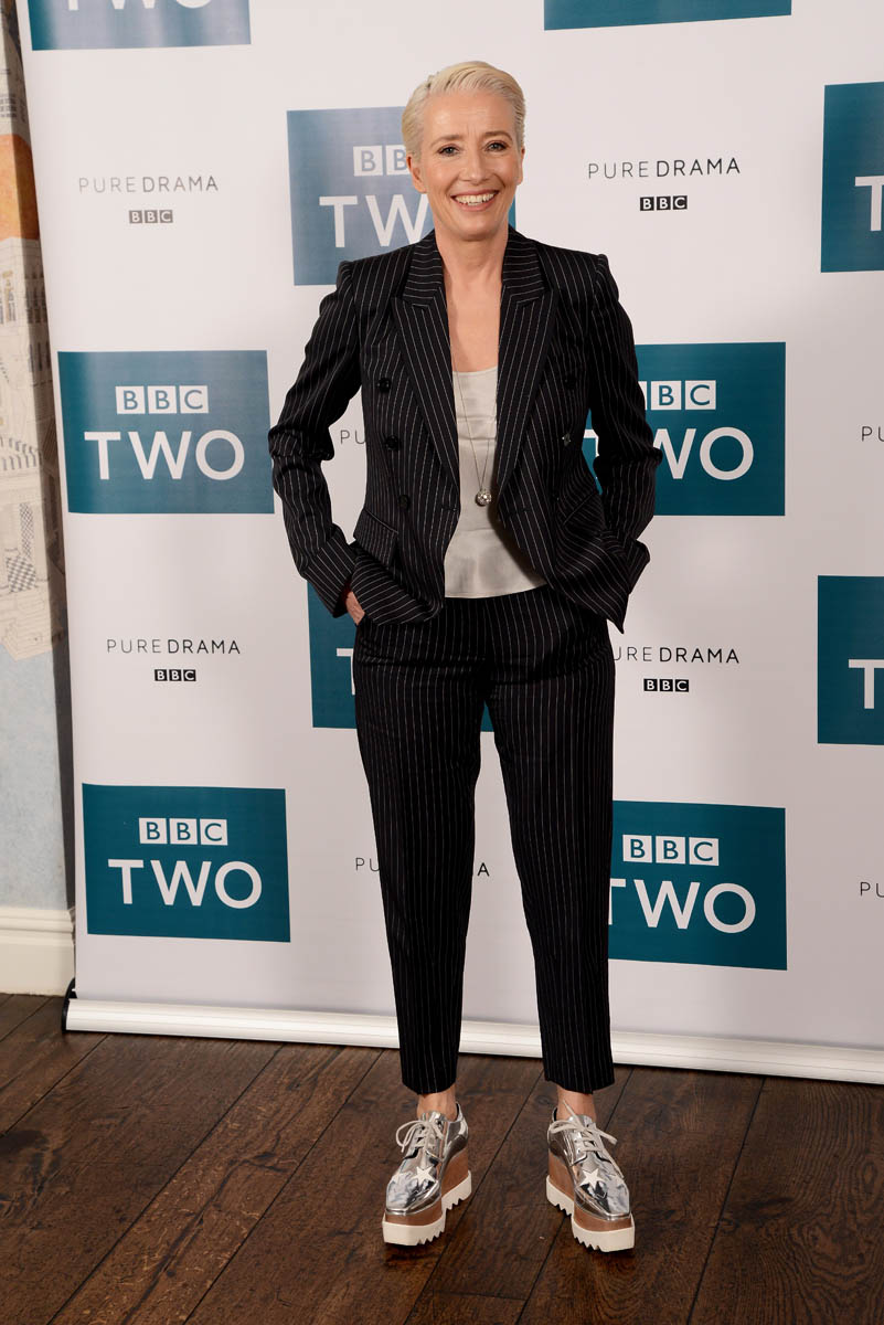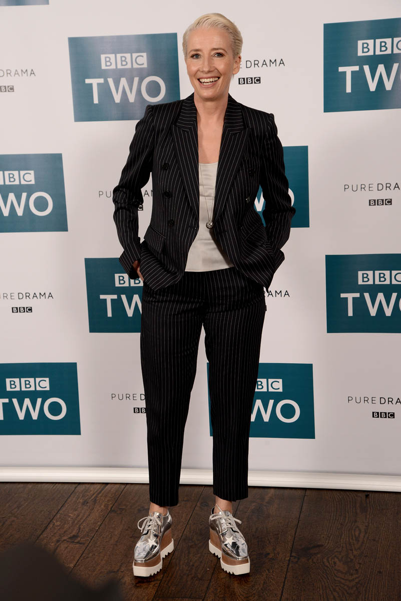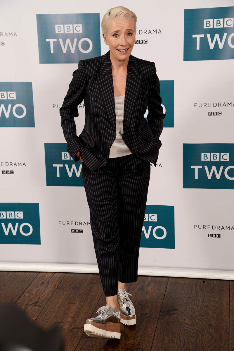 I mean, I don’t think I ever hate what Emma Thompson wears but this might be the most I’ve loved what she’s wearing: a well-tailored pinstripe suit, pants perfectly hemmed at the right length and Stella McCartney platform oxfords, which are not new, which we’ve seen on all kinds of celebrities…