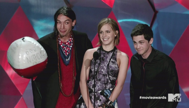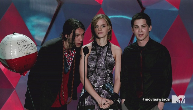 Anyway, Emma was there with co-stars Logan Lerman and stanky Ezra Miller to promote the new trailer for The Perks Of Being a Wallflower. I enjoyed the book. It’s about high school. So OF COURSE I’m seeing the movie even if that means enduring the insufferable Miller who dragged a balloon around with him last night like it was the most clever accessory ever. Click here if you’ve not yet read my Ezra Miller encounter. It was recently announced that Miller’s been cast as Leon in an upcoming adaptation of Madame Bovary played by Mia Wasikowska. Poor Mia Wasikowska will be dry-heaving for months.