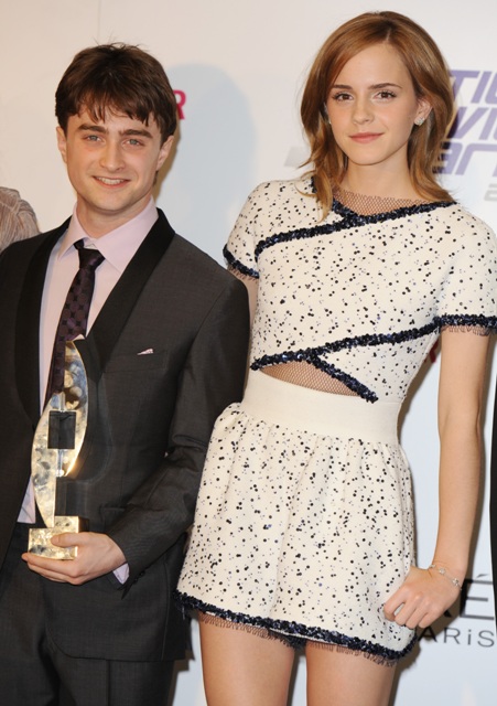 Emma Watson, Daniel Radcliffe, and Bonnie Wright accepted the Family Film Award last night at the National Movie Awards in London. We are just 3 weeks away from the grand opening of The Wizarding World of Harry Potter at Universal Studios. I can’t think about this.