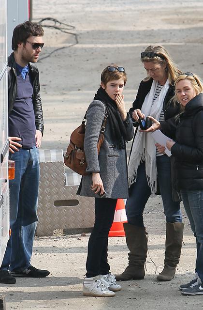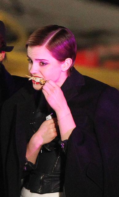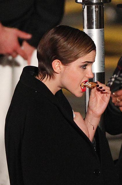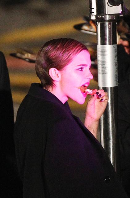 I also like the shots of Emma arriving on set in street clothes. And it appears she and Cyril do get along when the camera’s not on too. Bonus photo – she eats!