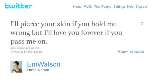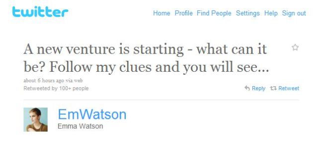 Emma Watson is weaving one on her Twitter. (Seriously, every sentence you can make with Twitter sounds dirty.) She hadn’t tweeted since February 22nd. Then today, out of the blue, this: