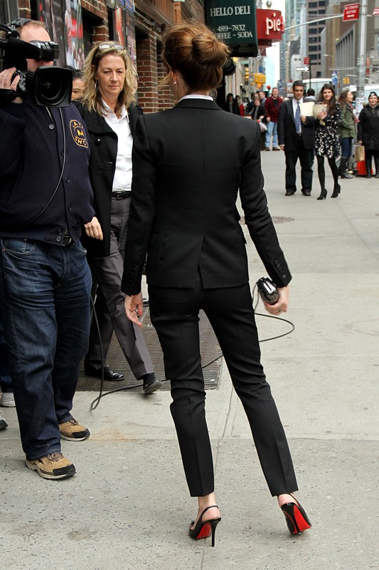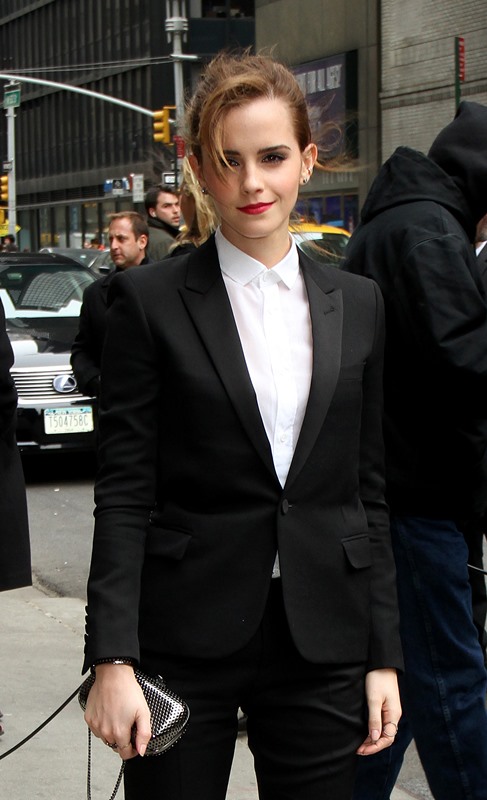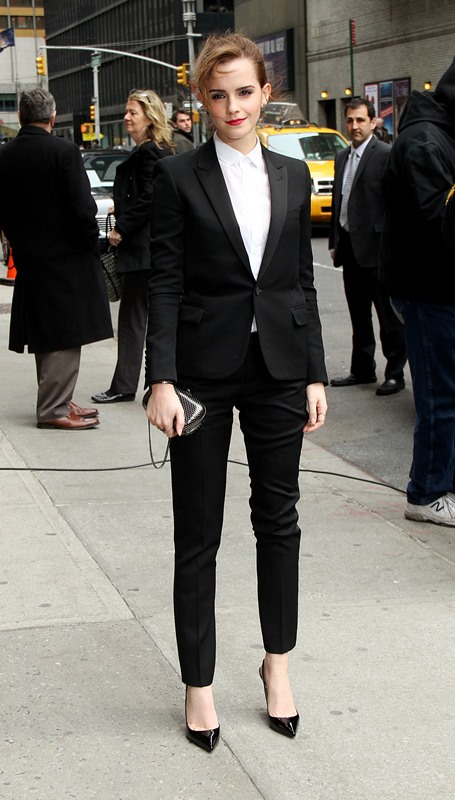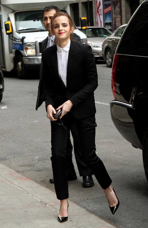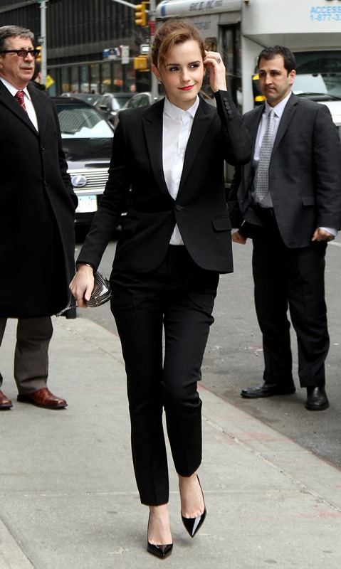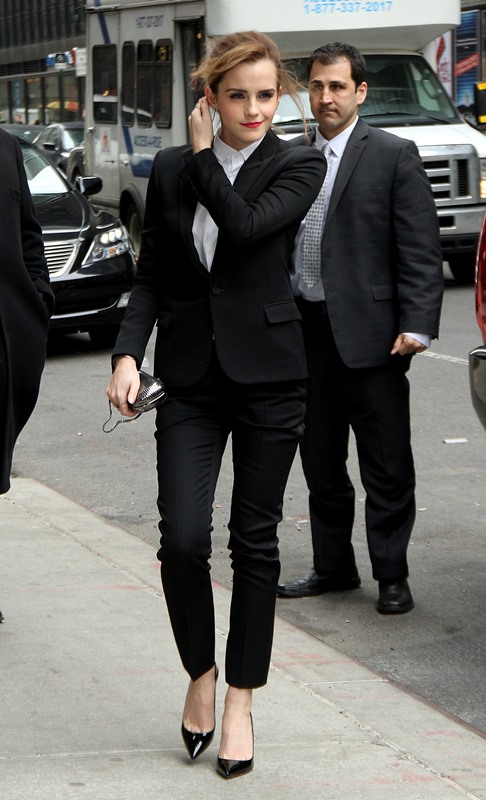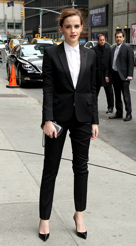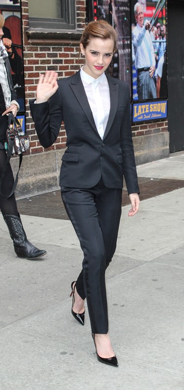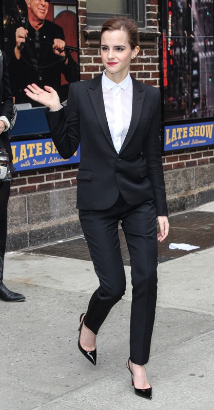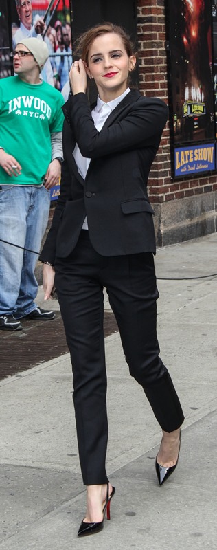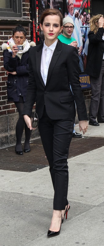I love everything about Emma Watson’s look at Letterman yesterday. All of it. Even the slingback and I’m not normally feeling a slingback. But the suit is beautifully tailored. And the pant length is amazing. And I’m never going to complain about a crisp white shirt.