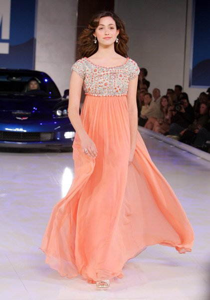 At the GM fashion show last night. I mean seriously gossips… have you ever seen someone so appropriately dressed? So exactly in tune with her own nauseating Rossum? Who else but Emmy would wear a dress so assy and so … peach??? Who else but Emmy could bat her doe eyes so sweetly and pull out her signature baby girl smile and begged to be petted? The only shame here is that she didn’t stay in that gorgessity all night. She actually changed it up for the red carpet. But still…the “over the shoulder” teacher’s favourite smile is there. And of course The Twirl. OF COURSE The Twirl! Would you want it any other way??? Source