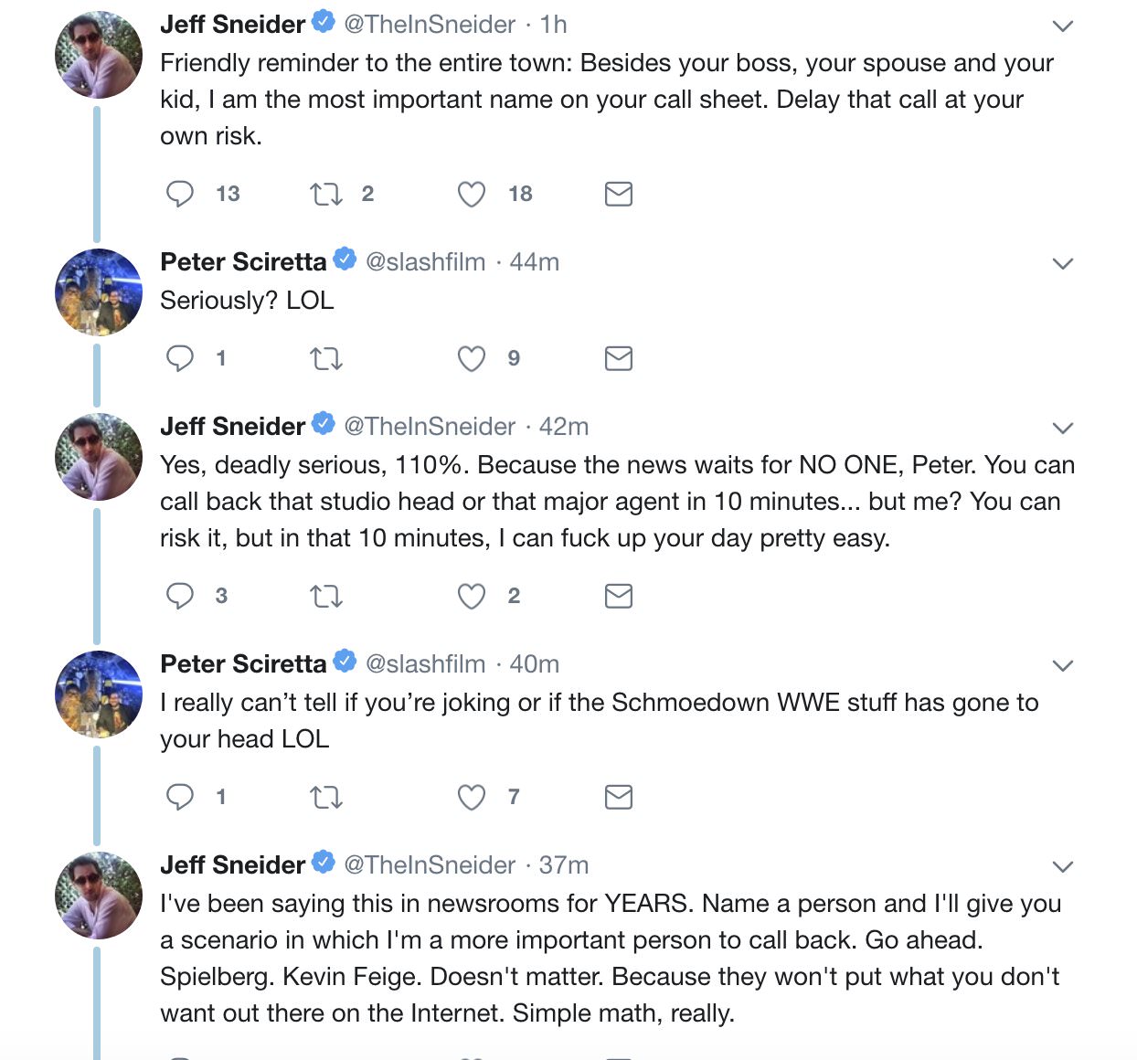 It's the “really anything else” that kills me. “There’s no reason anyone should get to see this movie before me,” is a helluva thing to say. Obviously, this wild ass email got transmitted far beyond Feinberg’s intended recipients, as deranged demands usually do. It reminds me of the time another entertainment journalist, Jeff Sneider, tweeted—X’ed?—that he was “the most important name on your call sheet” because “I can f-ck up your day pretty easy”.