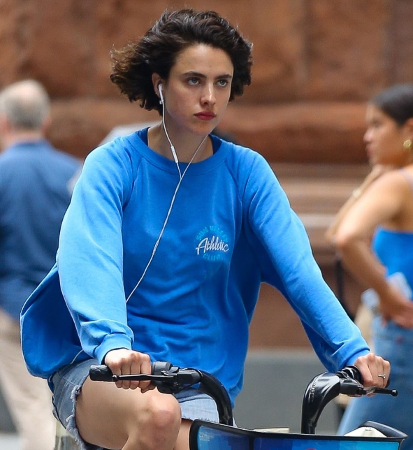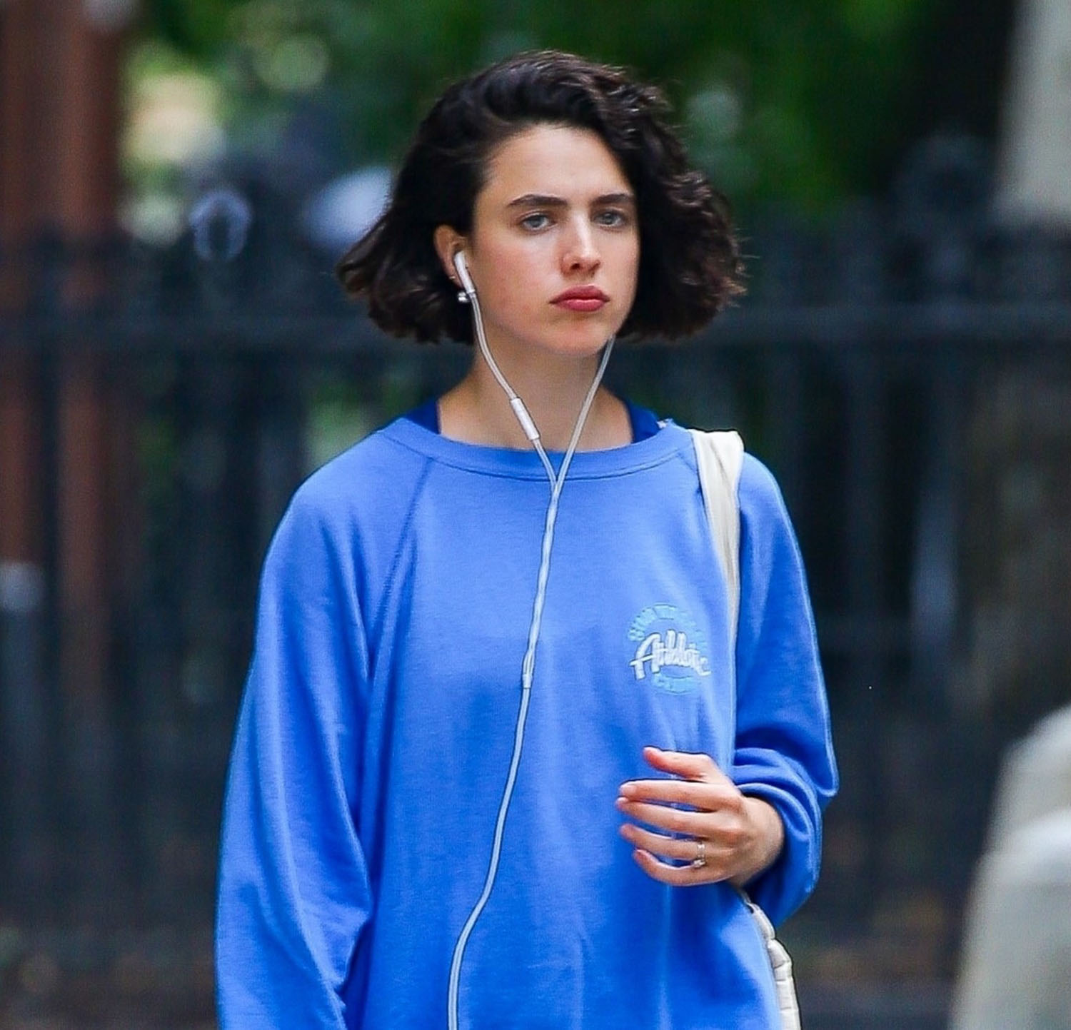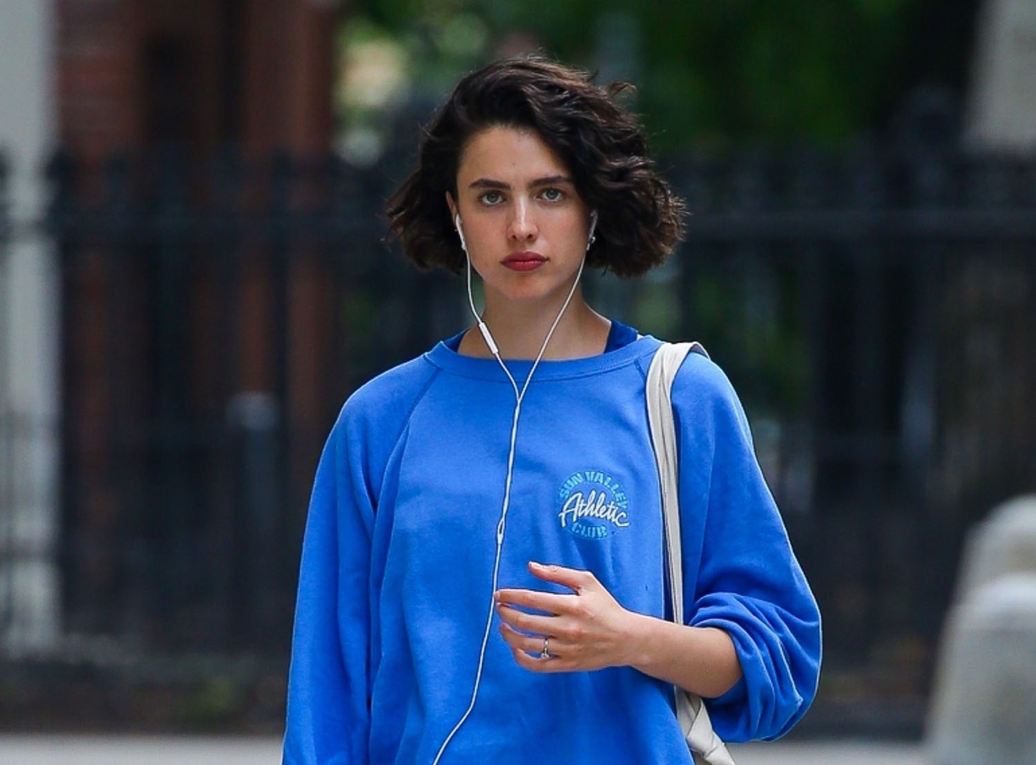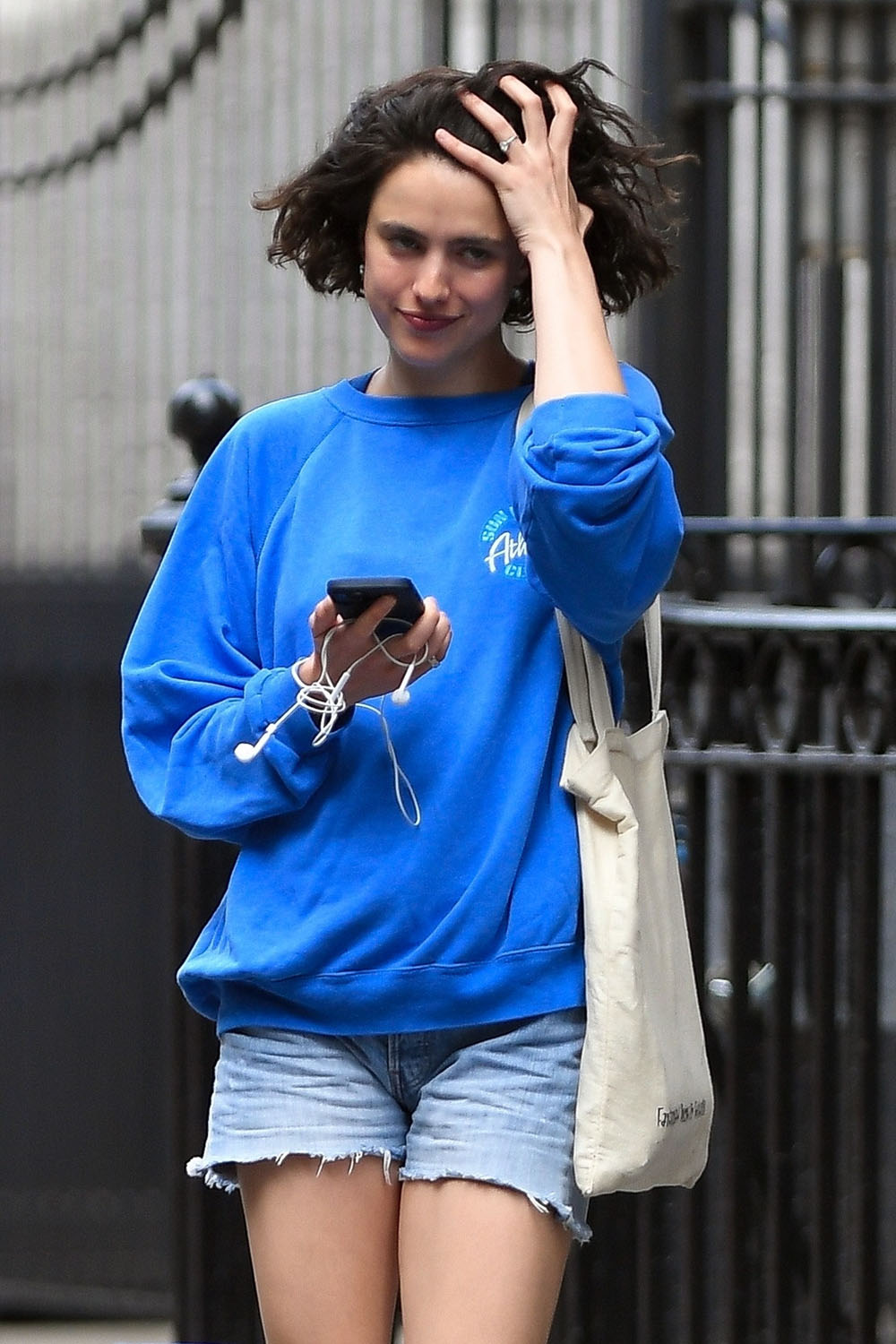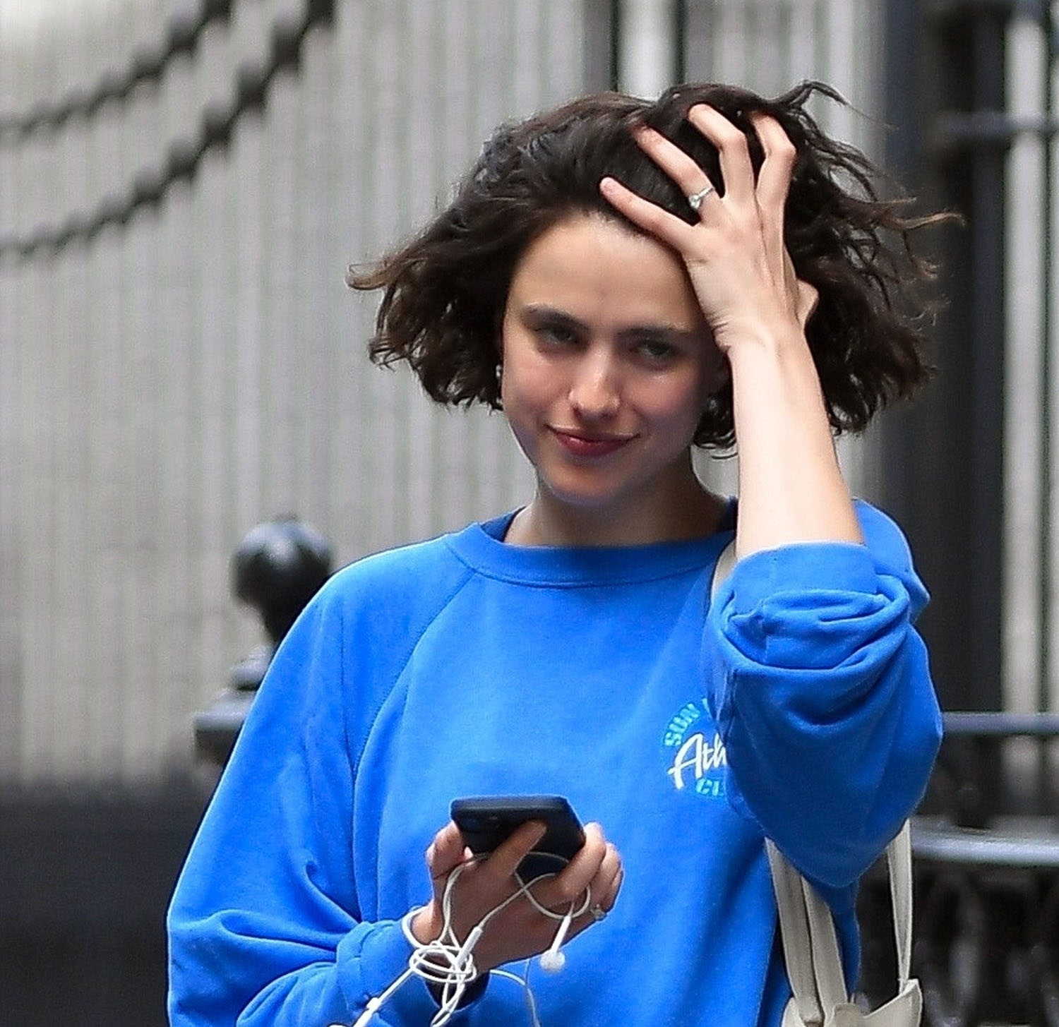Here is Margaret Qualley in New York yesterday, sporting her engagement ring from Jack Antonoff.