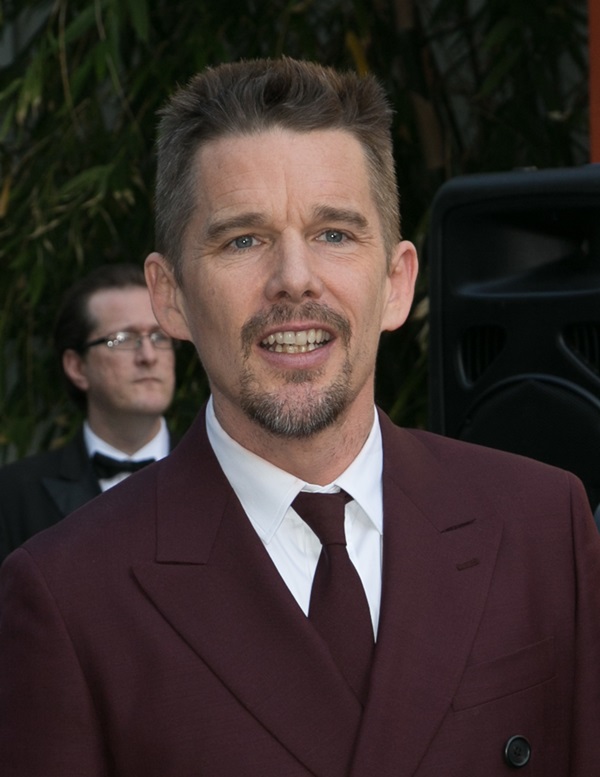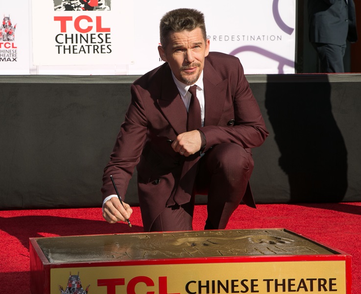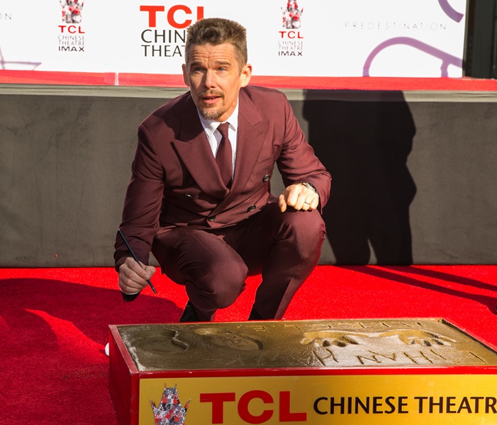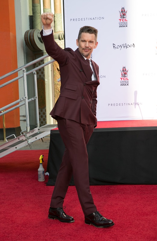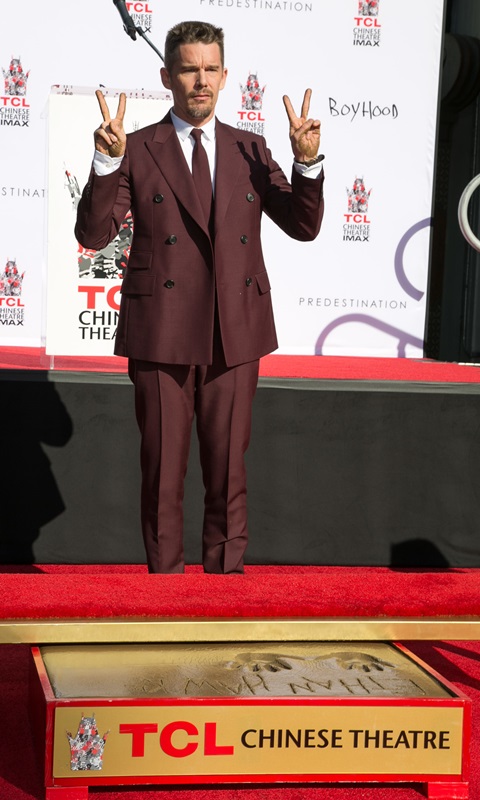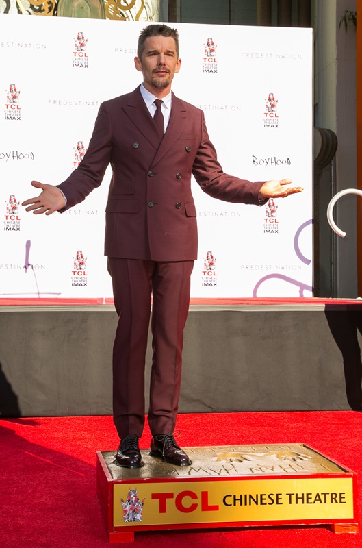 Today was Ethan Hawke’s hand and footprint ceremony in Hollywood. This is considered a lot more prestigious now than getting a star on the Walk Of Fame. It seems like now you can just buy a star on the Walk Of Fame. It’s been a great couple of years for Ethan. Before Midnight earned him an Oscar nomination. And Boyhood is the probably the most acclaimed film of the year, for which he’ll likely receive a Best Supporting Actor nomination. He should totally bring back the eyeliner for the Academy.