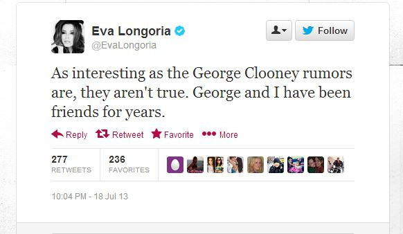 In response to US Weekly’s story, Eva posted this message on Twitter, basically denying that there was ever anything between her and George because they’ve been “friends for years”: