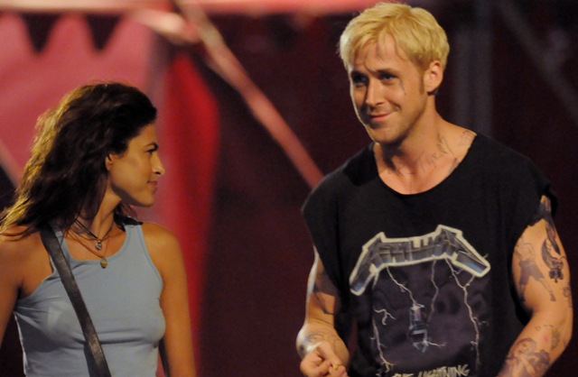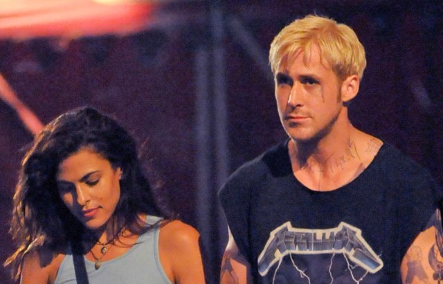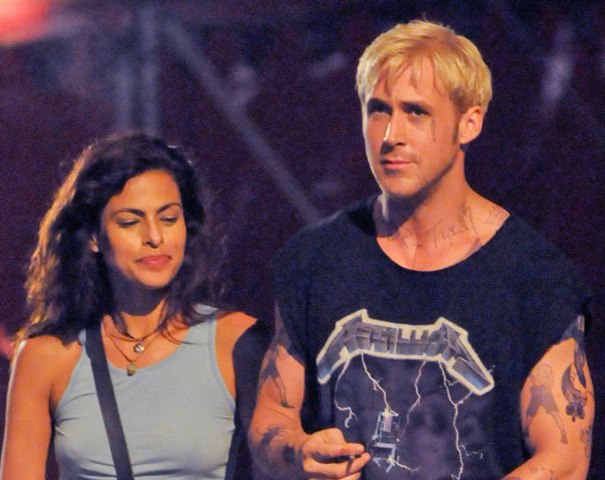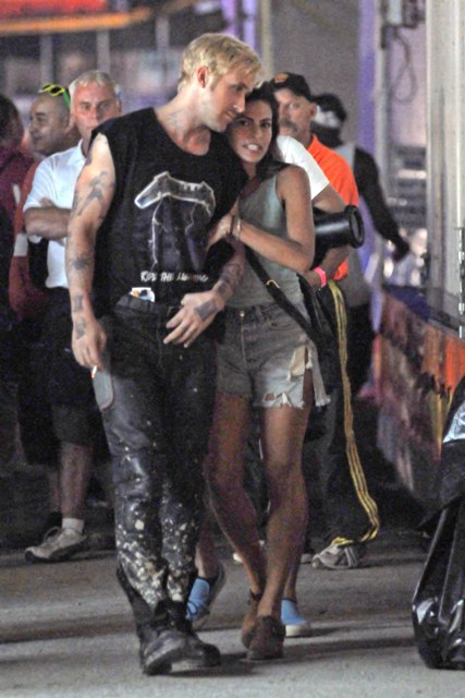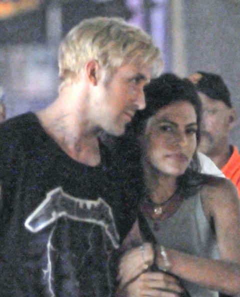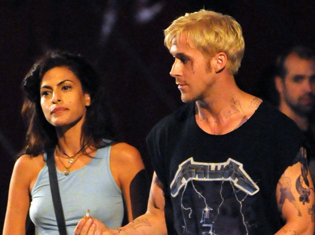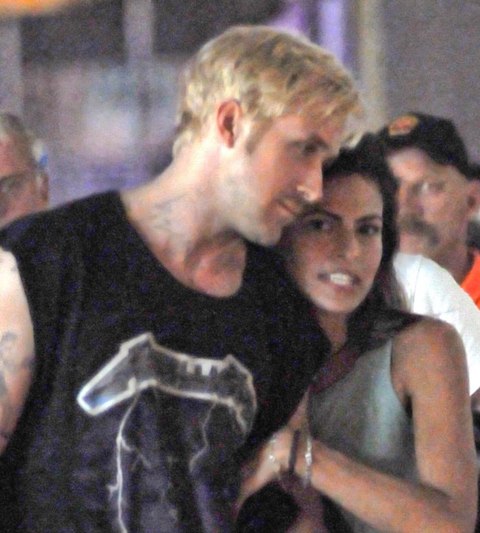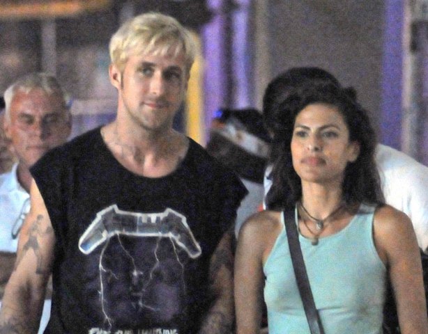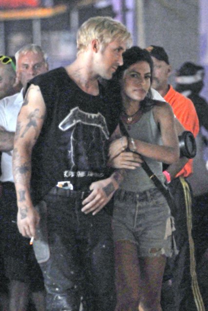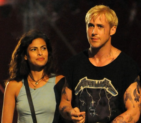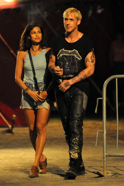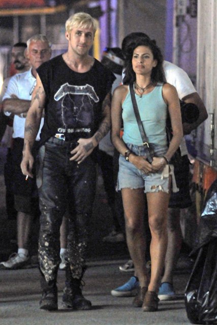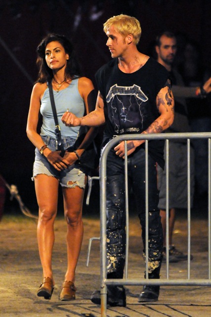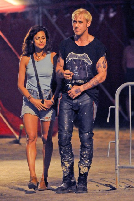 They were photographed together last night on the set of The Place Beyond The Pines. Am assuming she plays his girlfriend. And? Is it working for you? When it comes to Eva, who brings a palpable sexuality to almost everything, I could totally see it, because he’d have to be dead inside not to feel something. She’s crazy hot. Especially here, in this outfit. Her legs. Her natural beauty. That’s not to say that means they must be f-cking. But you can’t tell me that he doesn’t find her attractive. Please. Look at them together. Look at the way he’s looking at her mouth, leaning up against that barricade.