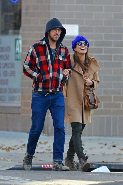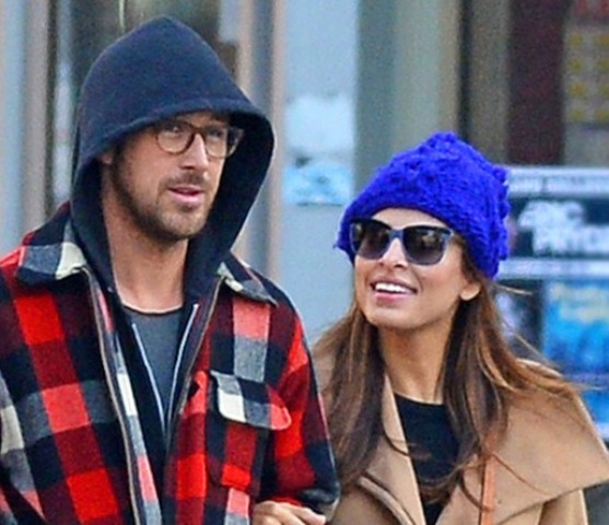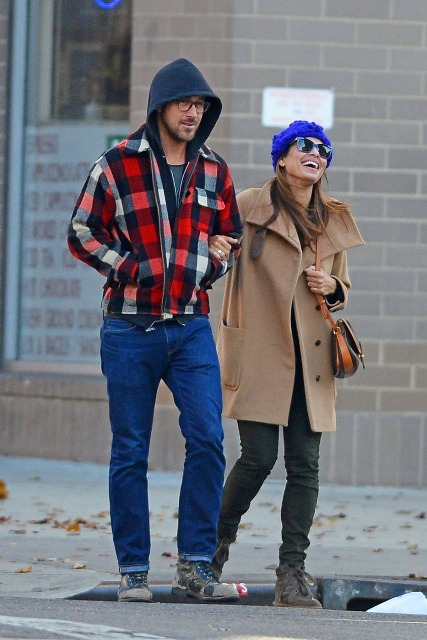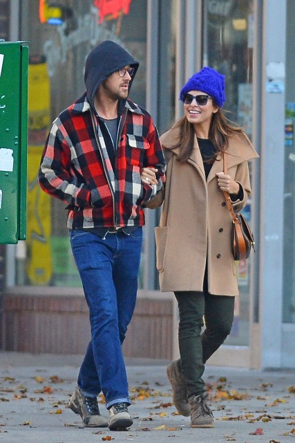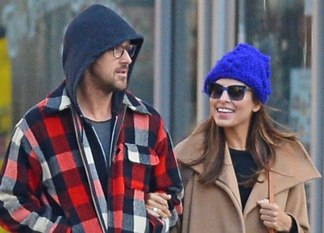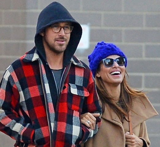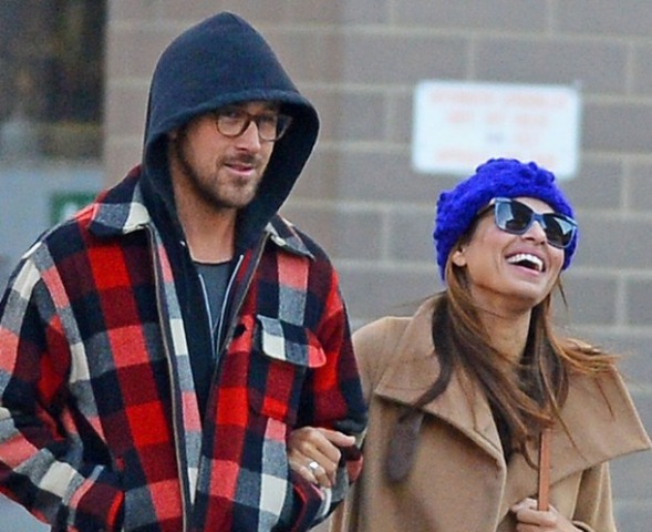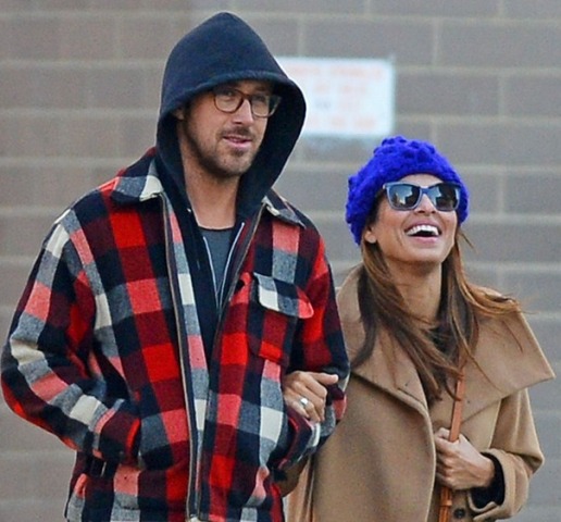 Some of you insisted, via my inbox, that since they’d not been photographed together in weeks while he was in Austin and Mexico on Terrence Malick’s movie and she was in New England shooting with Larry David, that it must have meant they’d cooled. As I reported last week though -- click here for a refresher -- Eva did drop in at least once on Ryan in Texas, and with his sister too. Anyway, as you can see, it’s all good. It’s been over a year now. Close to a year and a half, so about half the distance he travelled with Rachel McAdams. You remember what he said about their breakup in GQ a few months later? About how, like, the people were more sad about it than he was?