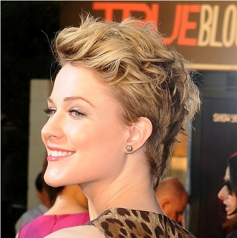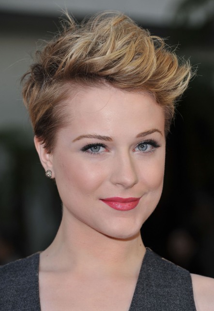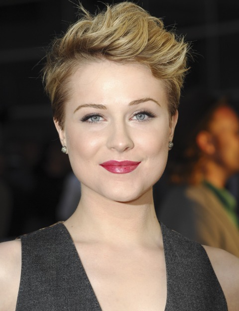 This is Evan Rachel Wood last night at the premiere of True Blood Season 4 in LA working a new short haircut – buzzed at the sides, longer on stop, and in back too. If I were her age, and had her shape, and the sort of hair that bends softly and doesn’t stick up, I’d do the same. At least once I’d do the same. And I’d also wear it with a waistcoat and suspenders too. All of it, I can’t get enough of it. I can’t get enough of how it is from the back. She looks AMAZING.