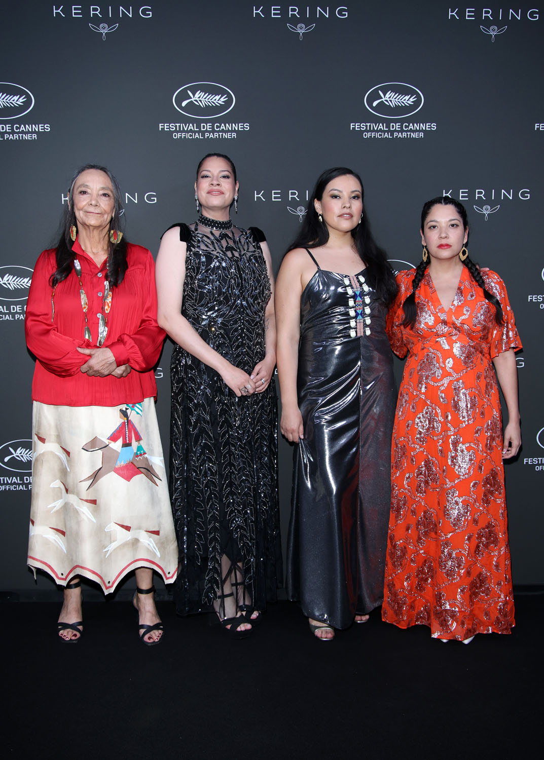Gladstone looked incredible at the premiere, in a bold Valentino print and with spectacular earrings by Native jewelry designer Jamie Okuma. Gladstone always uses her red carpet appearances to rep Indigenous designers (Tantoo Cardinal and the other Indigenous actors, including Tatanka Means, Jillian Dion, Cara Jade Myers, JaNae Collins, and Yancey Red Corn were also rocking fabulous Native fashions all weekend). It was a good fashion weekend for Gladstone all the way around. She looked great at the photocall earlier on Saturday in a capelet and another fantastic pair of beaded earrings, and she wore a dreamsicle orange dress to a reception hosted by Apple on Sunday, ushering in summer pastels perfectly.