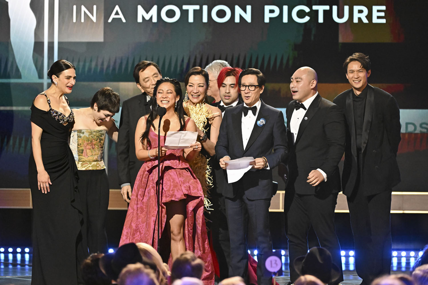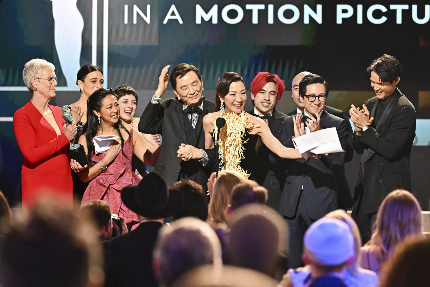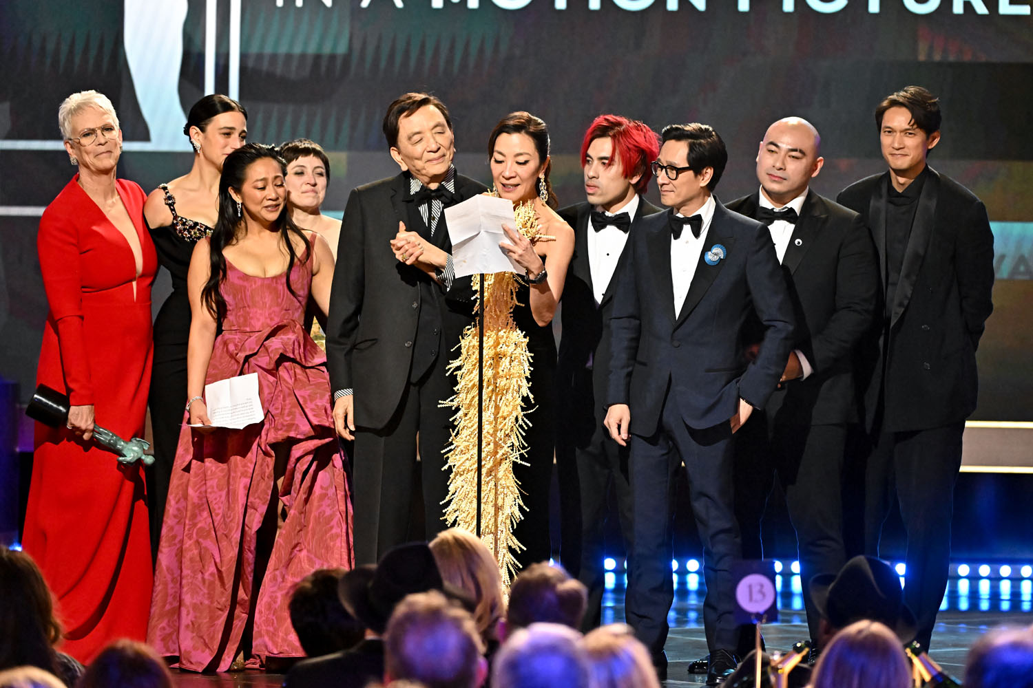 After the SAG Awards last night, Everything Everywhere All At Once is officially the Best Picture frontrunner. Sure, Top Gun: Maverick won the stunt ensemble award, but EEAAO won four awards, taking three of the four individual acting awards for motion pictures, including Ke Huy Quan for Outstanding Performance by a Male Actor in a Supporting Role, Jamie Lee Curtis for Outstanding Performance by a Female Actor in a Supporting Role, and Michelle Yeoh for Outstanding Performance by a Female Actor in a Leading Role (more on her later). Added to those three individual awards is the ensemble award for Outstanding Performance by a Cast in a Motion Picture, which makes EEAAO the most-awarded film in SAG history with four wins in total.