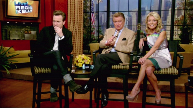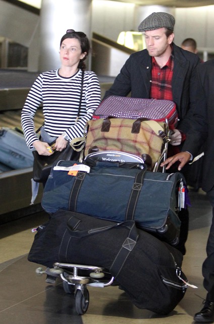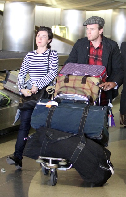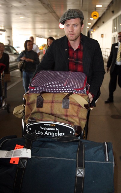 Ewan appeared on Regis & Kelly yesterday – screen shots attached. Then he and his wife Eve flew to LA, photographed with their bags arriving at LAX. Ewan, in a jaunty hat, took care of the cart as he led them out of the arrivals area. Am not sure if I approve of their luggage. The blue is fine. The black on the bottom has no wheels. This is hard on the shoulder because there’s no way of pulling it.