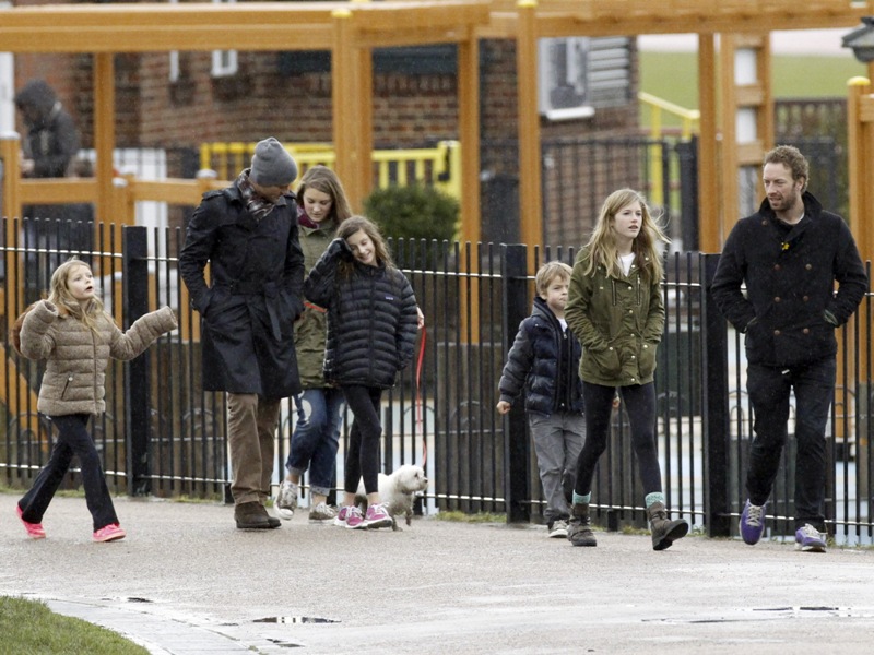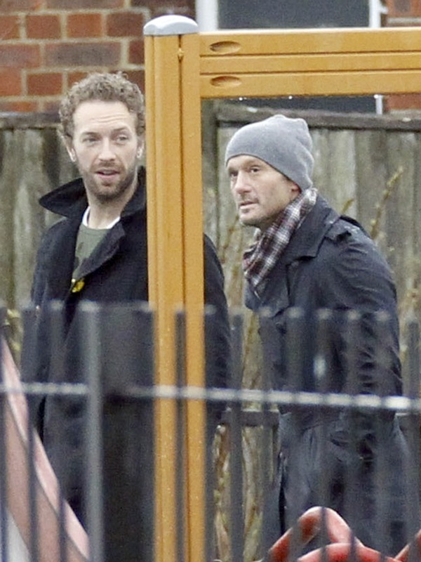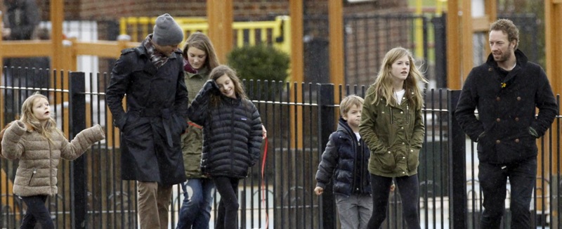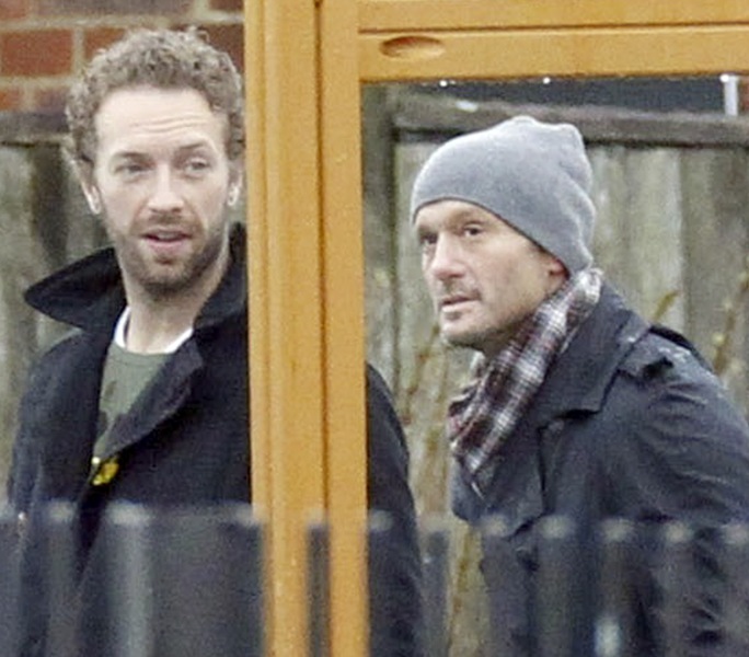 As I mentioned last week when Faith Hill and Tim McGraw arrived in London with their daughters, there would have to be a visit with the Paltrow-Martins. And here they are -- Chris Martin with the Hill-McGraws with his children and their children hanging out at the park...but no Gwyneth.