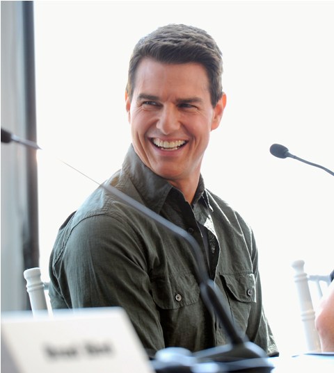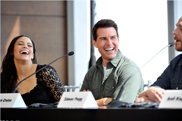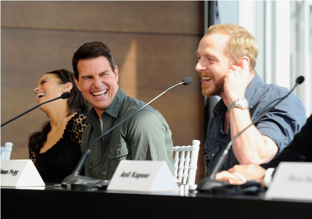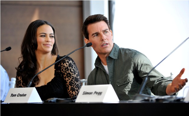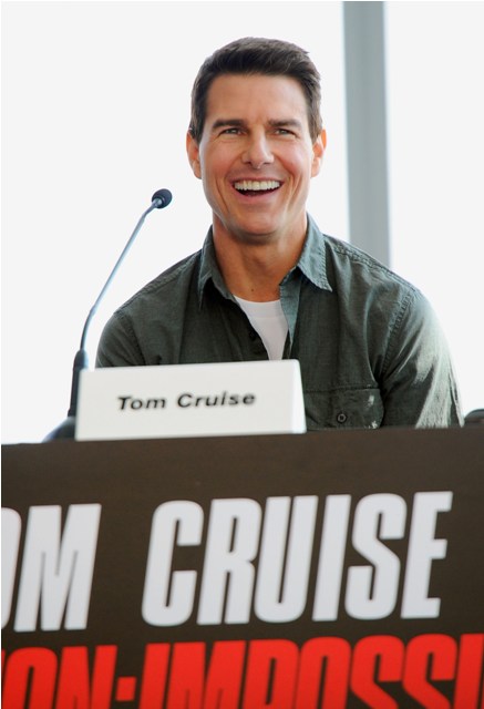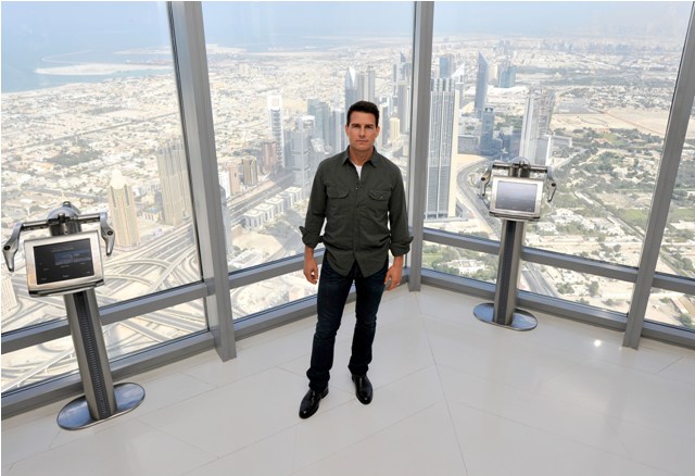 Here’s Tom today in Dubai with Mission Impossible: Ghost Protocol cast-mates Paula Patton, Simon Pegg, and Anil Kapoor at a press conference during the Dubai International Film Festival on the 124th floor of the Burj Khalifa. As previously mentioned, having just been to Dubai, I’m a little obsessed with it right now, especially the Burj Khalifa. I grew up staring at the CN Tower in Toronto. And the Burj Khalifa makes it look like a jumpy castle. When we were heading towards it from the airport after arriving, the driver pointed at it and said - Tom Cruise jumped from there! I’m just saying I don’t think they’ll have to fake enthusiasm for him in Dubai.