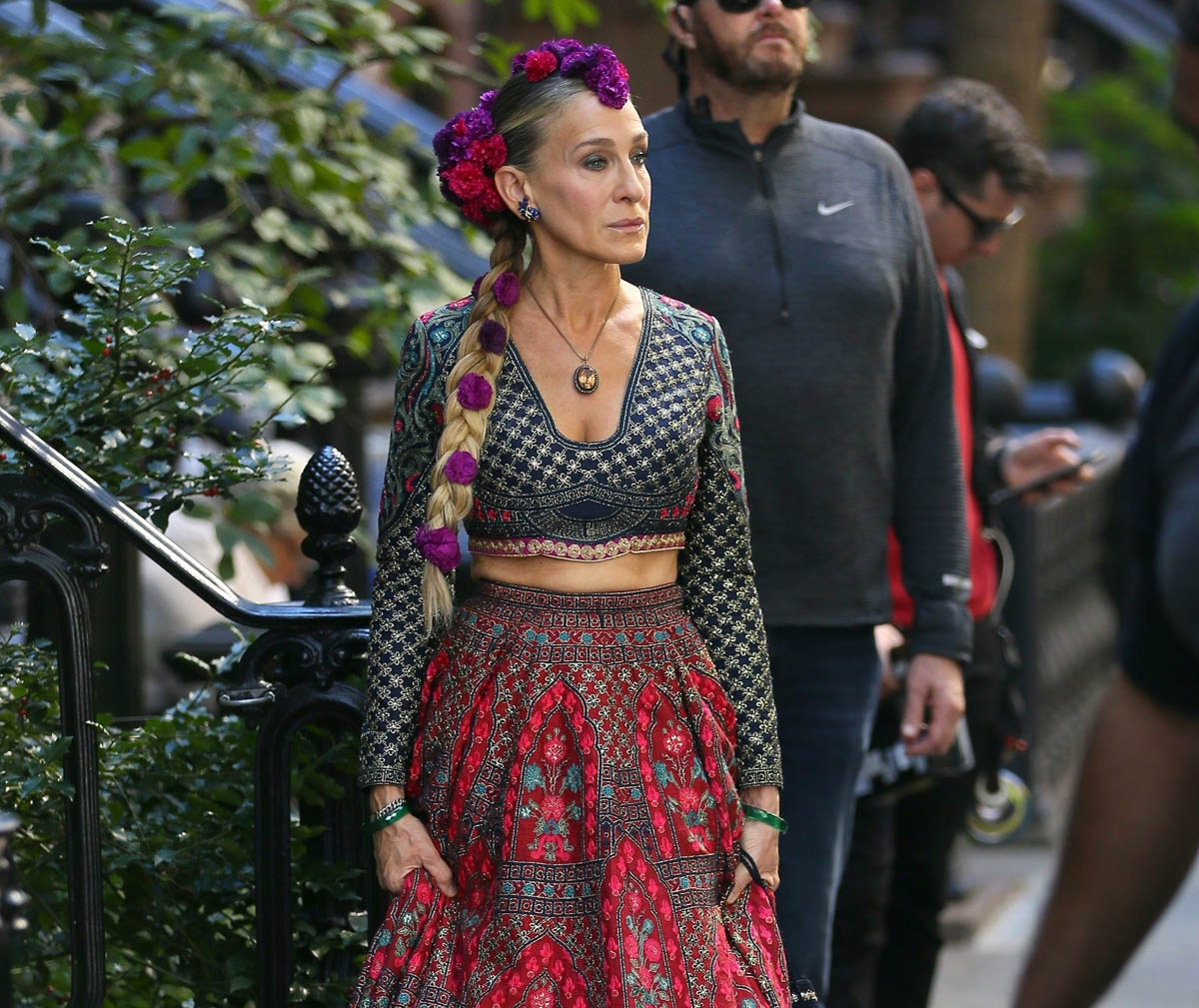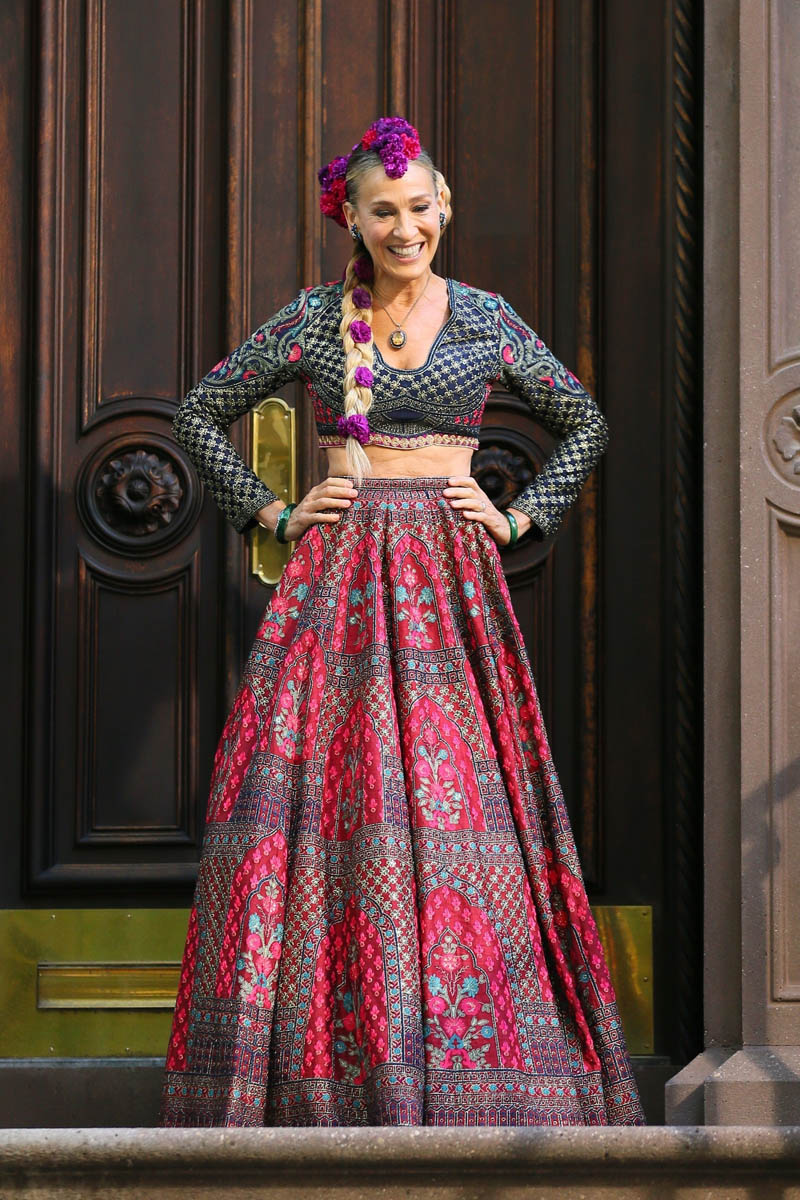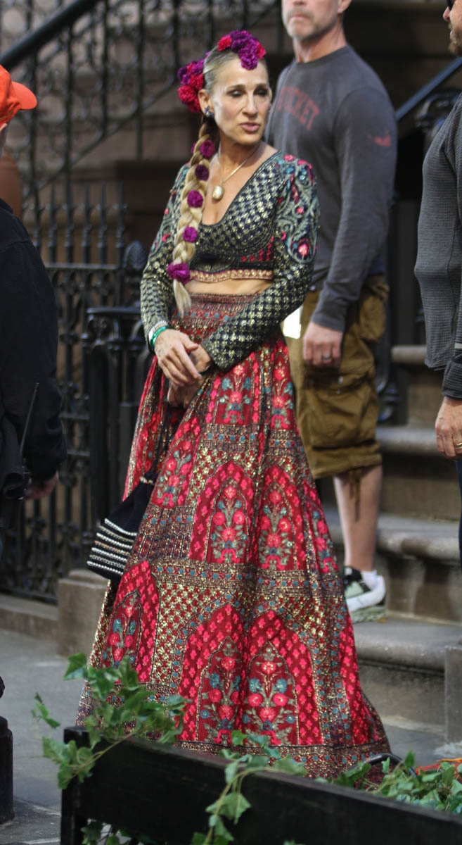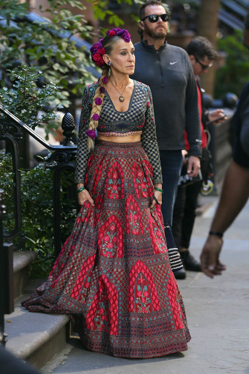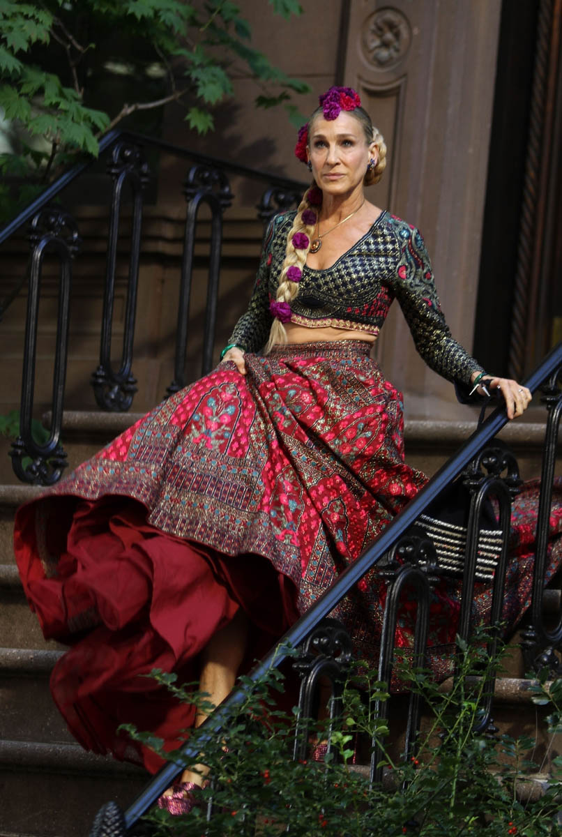 We might as well start with the fashion too – SJP was seen in an Indian outfit yesterday, stepping out of Carrie Bradshaw’s townhouse. According to the internet, the designer is Falguni and Shane Peacock India whose work was recently seen on philanthropist Sudha Reddy at the Met Gala: