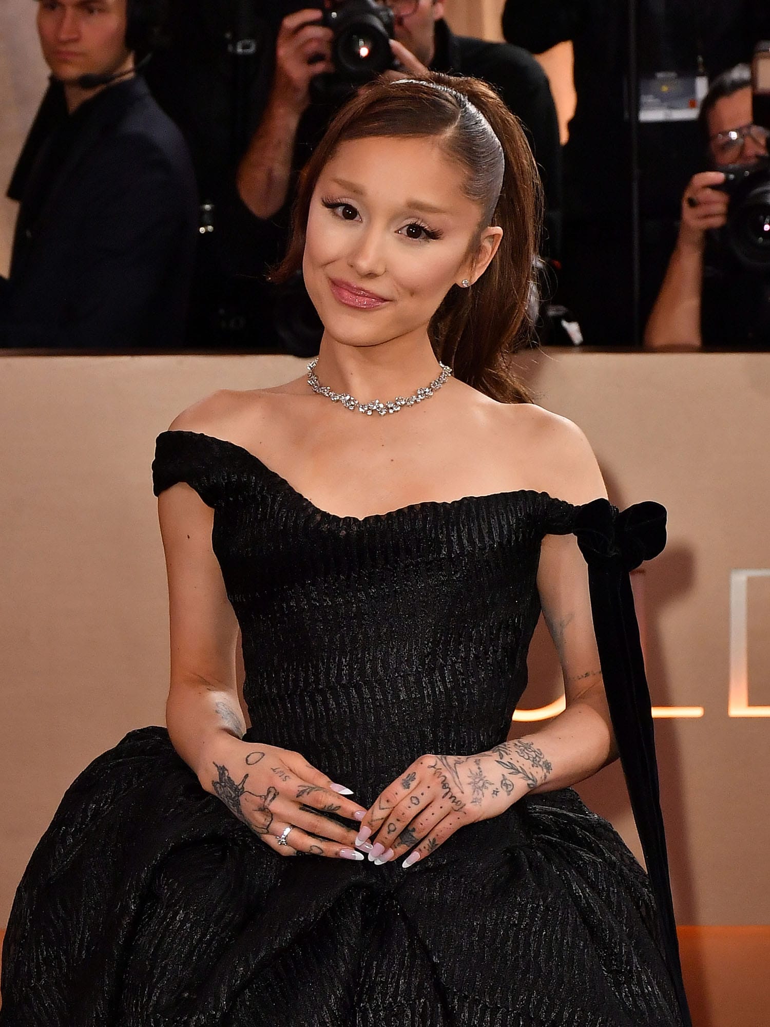 Ariana is either Glinda or Audrey Hepburn, but this look is neither. Maybe on someone else, the elements of the design would come through more – the structure and the shape – because I can see how pretty the skirt is, but I don’t know that she’s the right person to showcase it because it all seems to overwhelm her, especially since her hair is dark now, and with the dress so dark, and the nude lip too… nothing is popping.