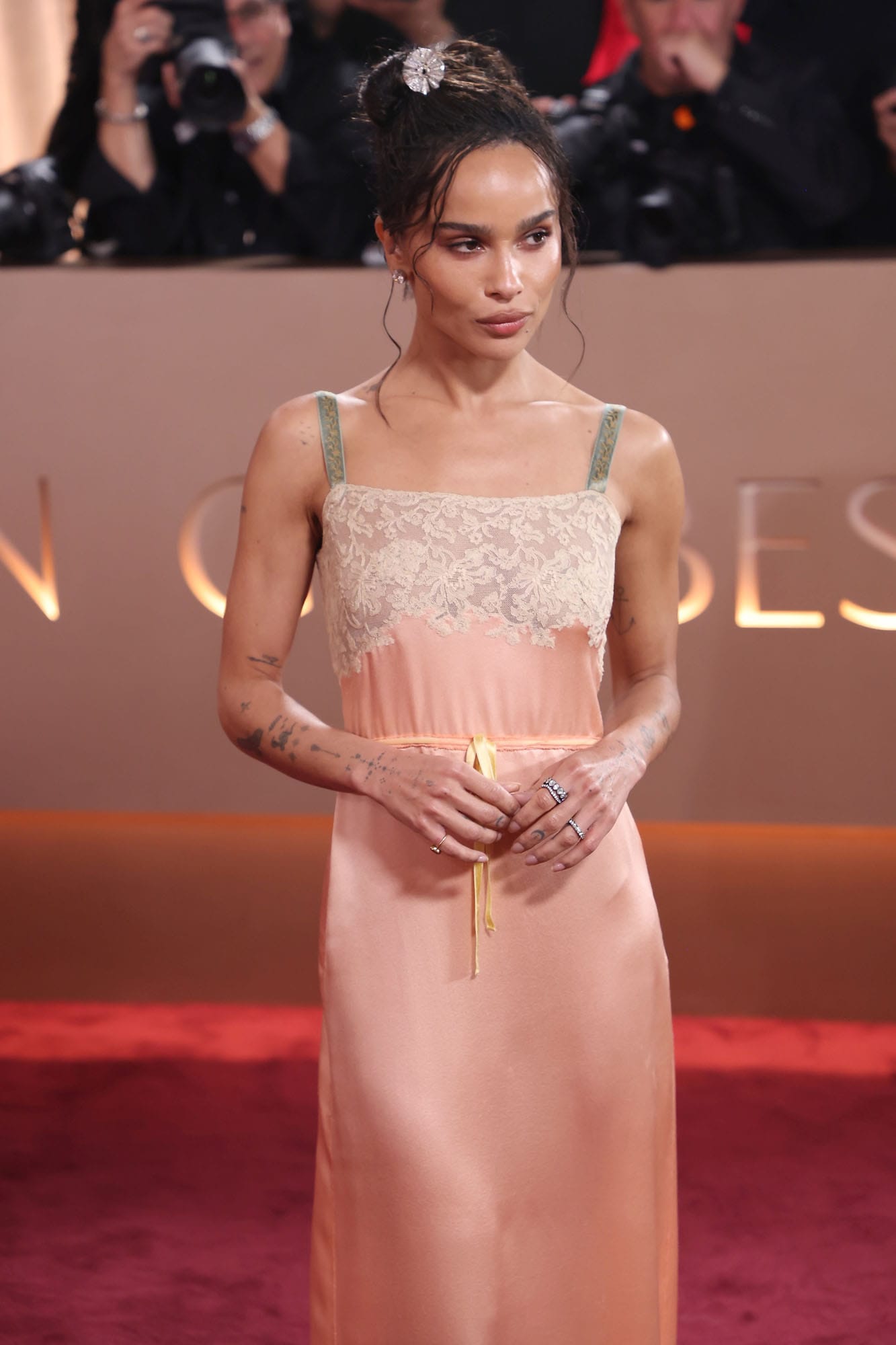 As for Zoë Kravitz, I feel like she was leaning in on the 90s with this slip dress, not mad at it, and I appreciated the departure from her usual black. No surprise, she’s in Saint Laurent here, but that’s also what’s a bit deflating. Because it’s one thing if it’s a thrift – like Drew Barrymore in 1995, layering two thrift slip dresses for a look that became iconic – but when it’s brand new, from a luxury house, and it looks thrifty, it loses the appeal.