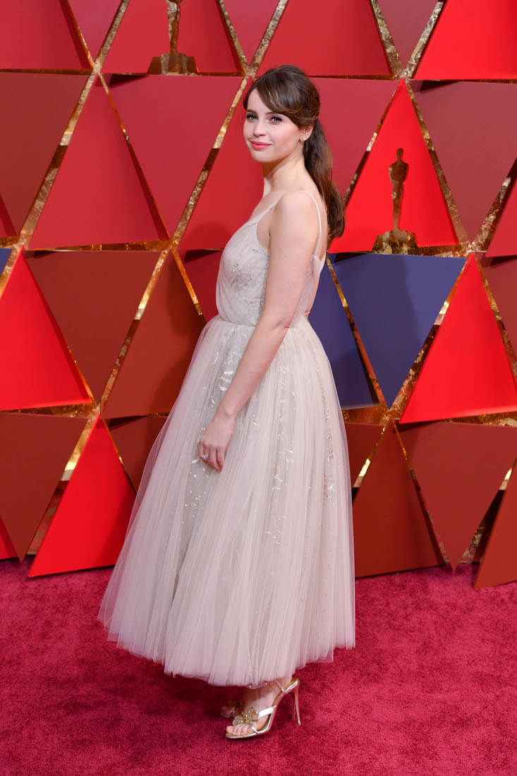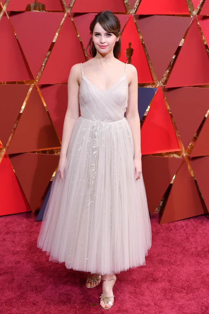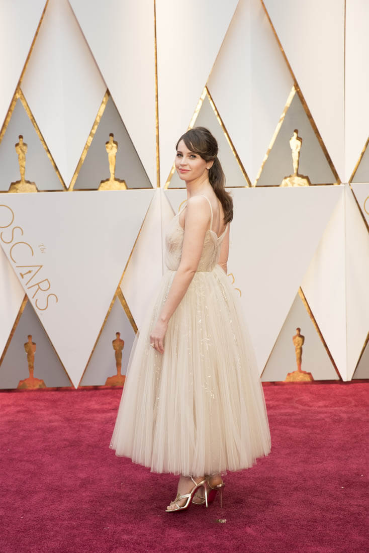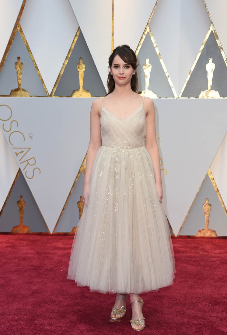 Don’t get me wrong, Felicity Jones is BEAUTIFUL. Maybe even prettier in person, although in person you are confronted with her complete lack of personality, so it’s kind of a wash. But she is lovely and really should be done better by on the red carpet, but her Rogue One press tour was a pale bland bowl of oatmeal, and now she’s worn a bowl of cream of wheat to the Oscars. She was just there to present—that’s a GREAT time to take a risk!