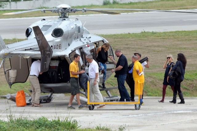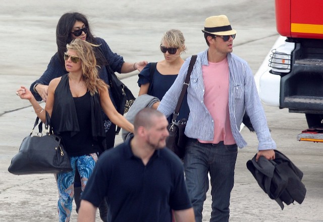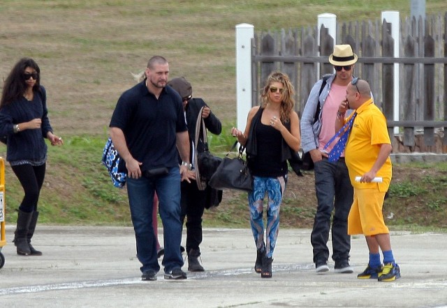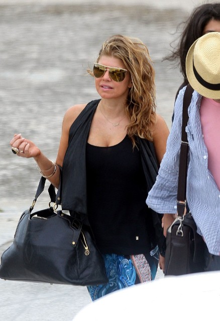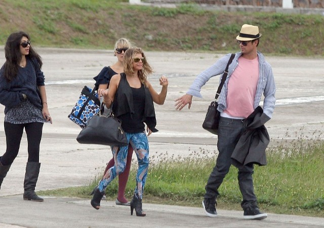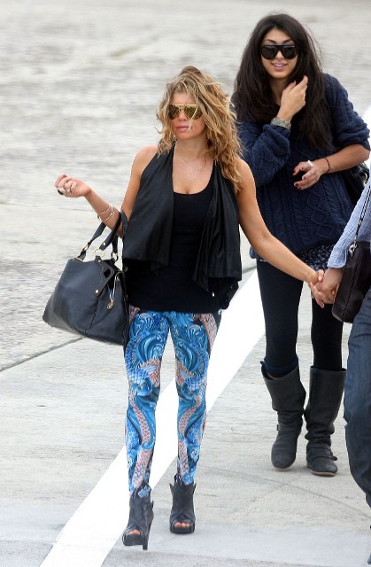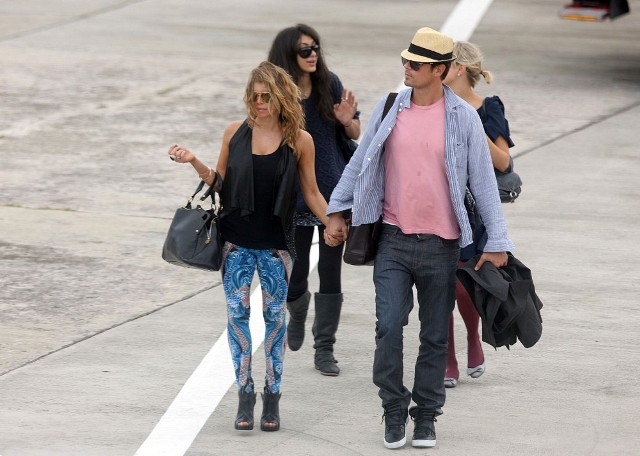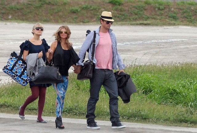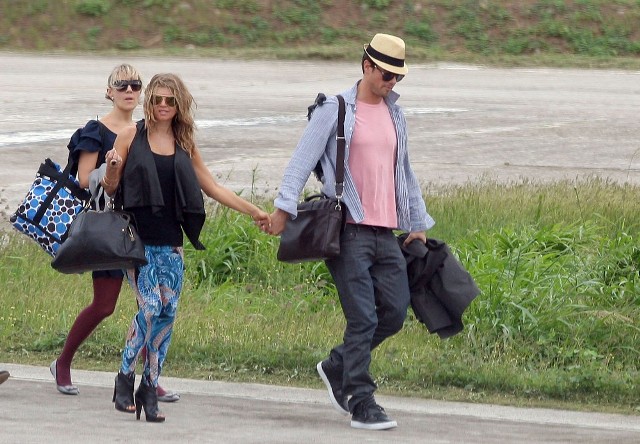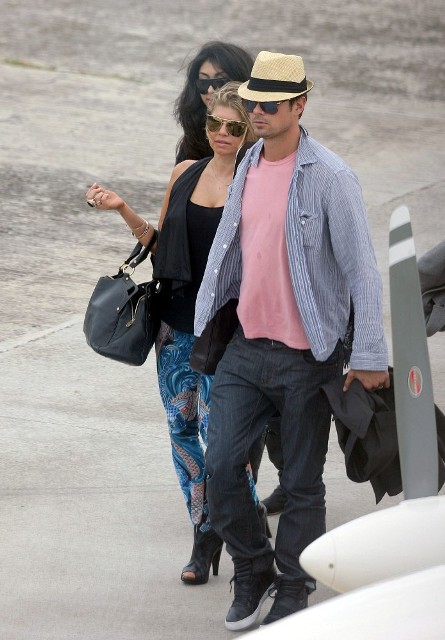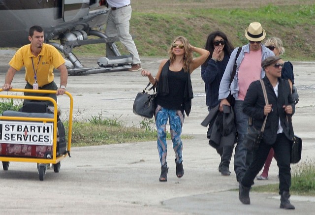 Looks like Fergie and Josh Duhamel are spending NYE in St Barts too. They arrived via helicopter today. As you can see, Fergie’s ready to relax in some loud ass pants. I particularly like the way they swirl from the back on both cheeks. You’ve got to have a certain confidence in the tightness of your buttocks to be able to step out in these without anxiety. It’s what a rock girl can get away with right? Fergie, Gwen Stefani, I’m ok with them in these pants. If it was Kate Bosworth she’d be laughed out the side door. That bitch doesn’t deserve a front exit.