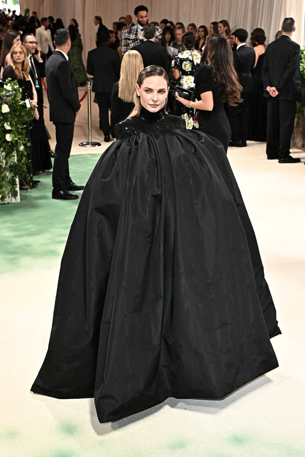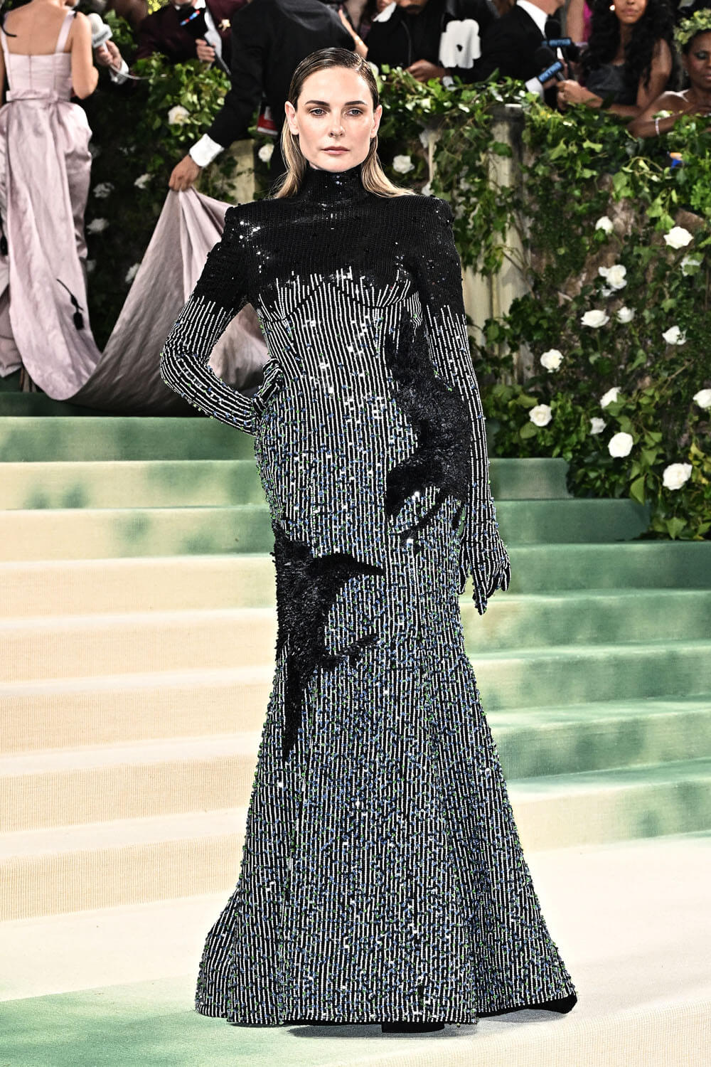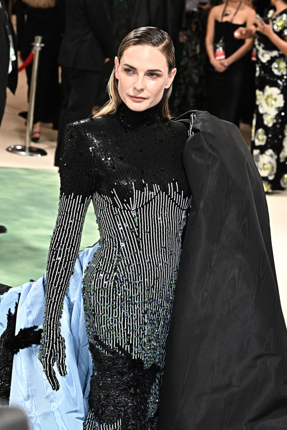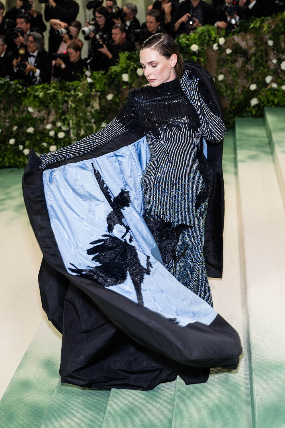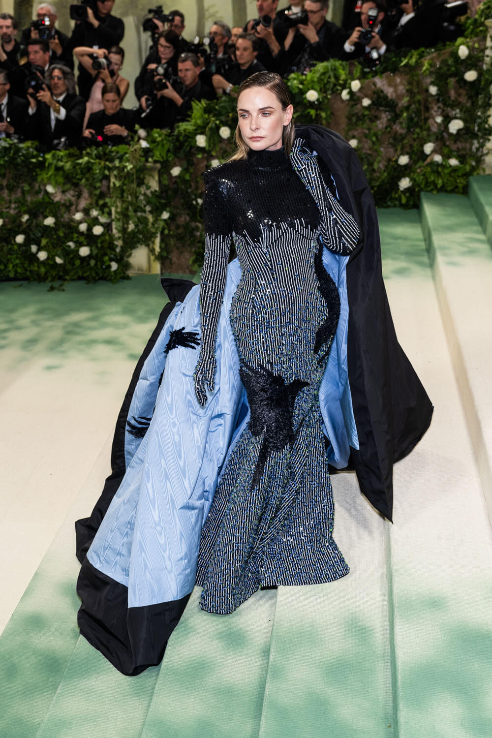 rebecca ferguson wears a custom thom browne gathered cape and high neck dress embroidered with 60,000 blue and green swarovski crystal florets for the 2024 met gala.@metmuseum#thombrowne #rebeccaferguson #metgala pic.twitter.com/stFX7FNdll